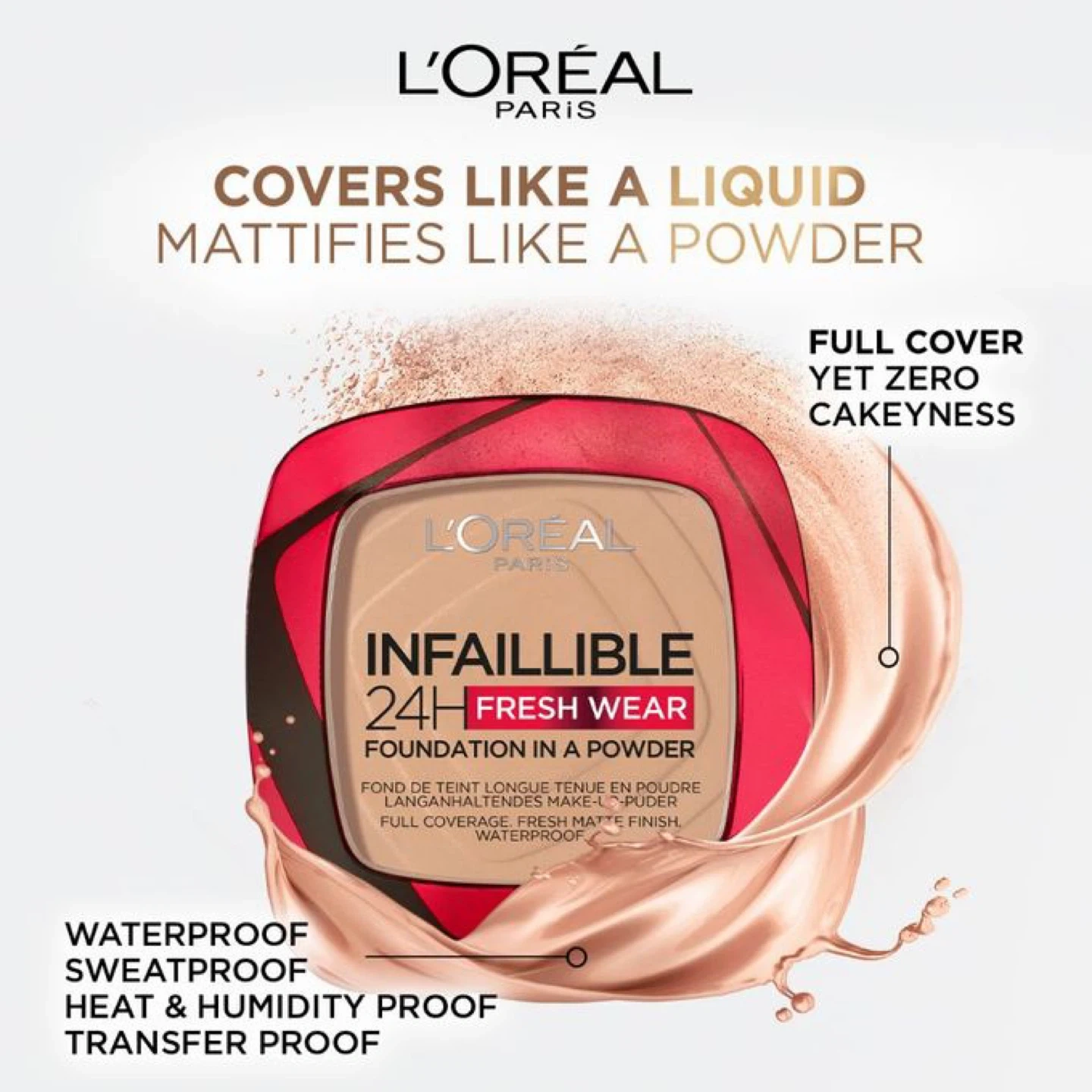 L'Oréal Makeup Duo/Set. Included is the Infallible 24H Fresh Wear Foundation in a Powder (shade 10 - Porcelain) and the True Match Lumi Glotion natural glow enhancer (shade 901 - light). The Infallible foundation provides full matte coverage, is waterproof, and sweatproof. The Lumi Glotion can be worn alone, under foundation, or as a highlighter. Excellent condition. Like new - test tried once.