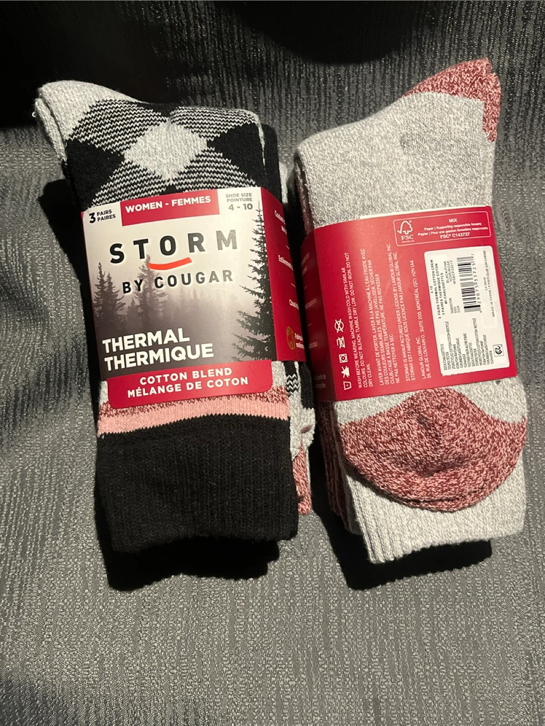 I have two packs of new Storm by Cougar thermal socks for sale! They're women's size 4-10 and made of a cotton blend. Perfect for keeping your feet warm and cozy this winter!