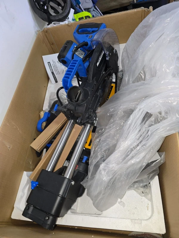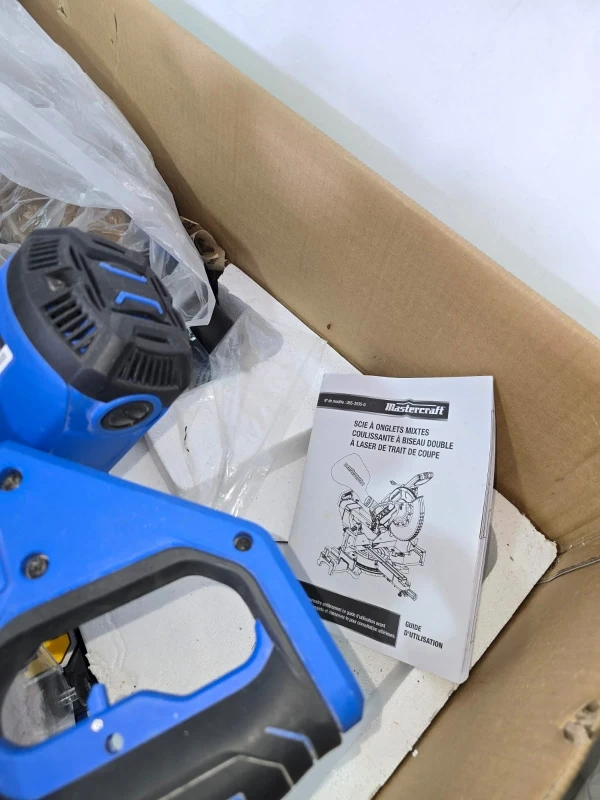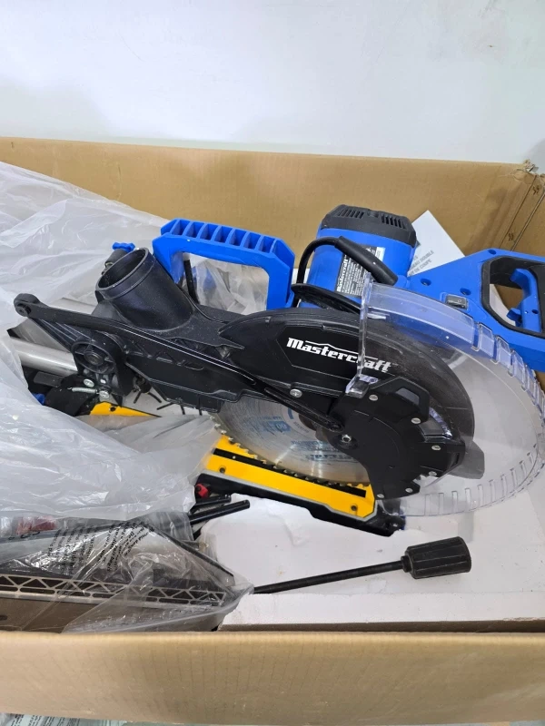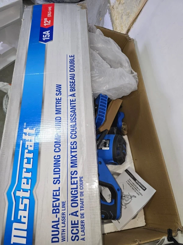 Selling a Mastercraft 12" dual-bevel sliding compound mitre saw. It comes with a laser line for precise cuts. Includes a 12" (30.5 cm) 60-tooth carbide-tipped saw blade, blade wrench, and instruction manual. It also has dual sliding rails and a clamping assembly. Perfect for lumberyards and woodworking projects