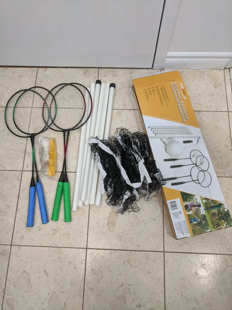 Get ready for some fun in the sun with this Sportime Badminton Set! It features a easy net and pole system .The set includes badminton rackets with tempered shafts and white shuttlecocks. Complete with all accessories, it's perfect for a friendly game of badminton in your backyard!