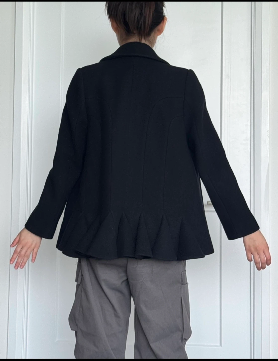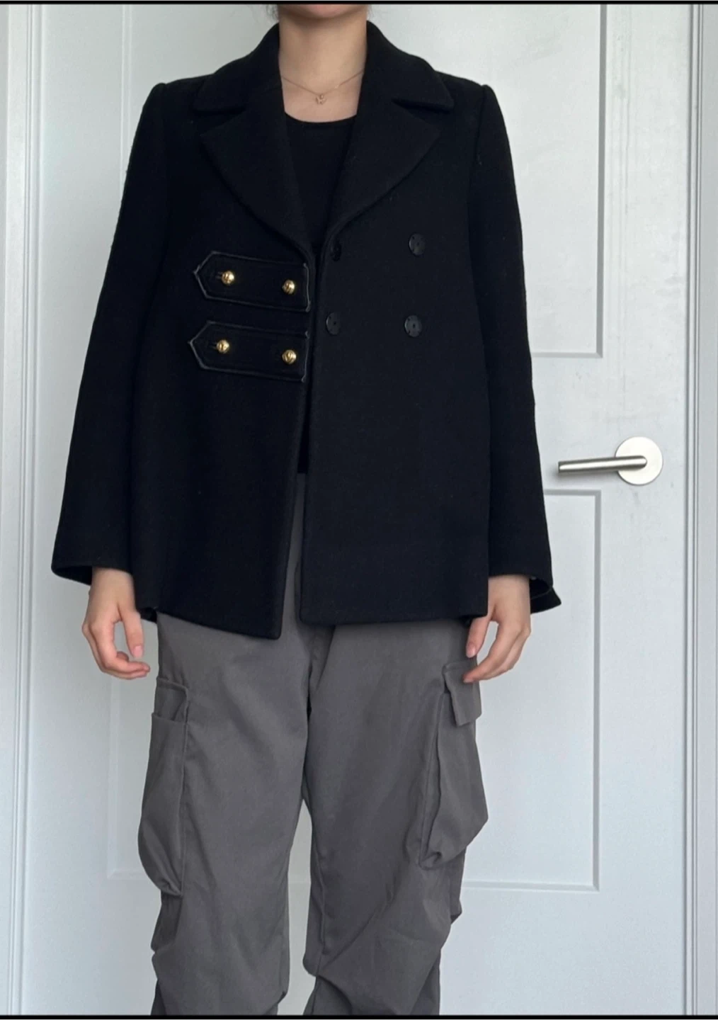Here's a stylish and cute black jacket that's perfect for adding a touch of elegance to any outfit! It has a peacoat style with unique detailing. Golden buttons in the front and a cute frill in the back.