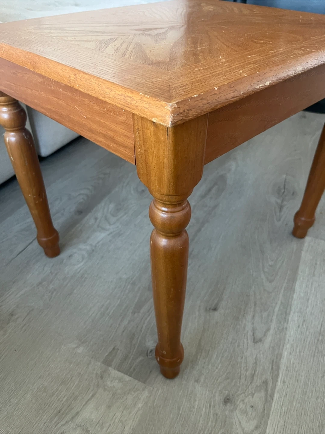 Selling a wooden coffee / side table. It has a square top with a patterned design and classic turned legs. It shows some signs of wear, like a few scratches on the surface, but it's still functional. Perfect for a living room or bedroom! Just slightly wobbly.