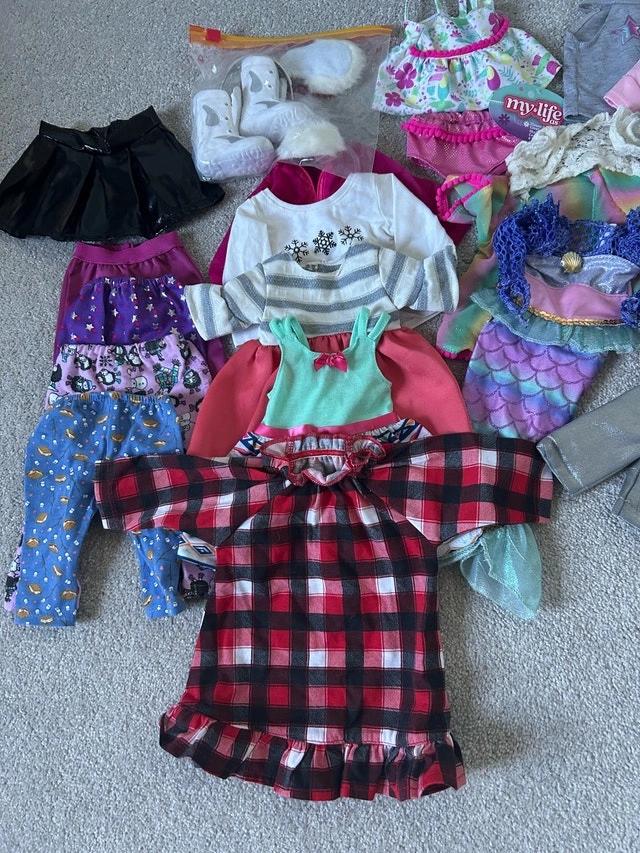 ⭐️ Huge Mixed Lot of 18-Inch Doll Clothes & Accessories ⭐️ A fantastic starter or expansion wardrobe for any 18" doll collector! This pre-loved lot includes a wide variety of outfits and accessories designed to fit most popular 18-inch dolls, including American Girl, Our Generation, My Life As, and similar sized dolls. Total of 18+ Pieces! (Please count photos to confirm exact total) What’s Included in the Bundle: Dresses/Outfits: [e.g., Pink butterfly dress, blue plaid overall dress, yellow floral top & pants set] Tops/Bottoms: [e.g., Striped T-shirts, colourful leggings, denim pants] Pajamas/Loungewear: [e.g., Unicorn print pajama bottoms, slippers/socks] Accessories: A variety of shoes, boots, sneakers, socks, and maybe a small purse/headband. (See all photos for exact items) ✨ Condition: All items are in great pre-loved condition, clean, and ready for play or display! There may be minor signs of gentle play, but no rips, tears, or major stains. Please inspect all photos closely as they are part of the description. Perfect for: A holiday or birthday gift! Expanding a doll's wardrobe on a budget. Creative mix-and-match play. Brand: Mixed lot (mostly unbranded or off-brand generic for 18" dolls). Size: Fits all 18" dolls (AG, OG, My Life As, etc.)