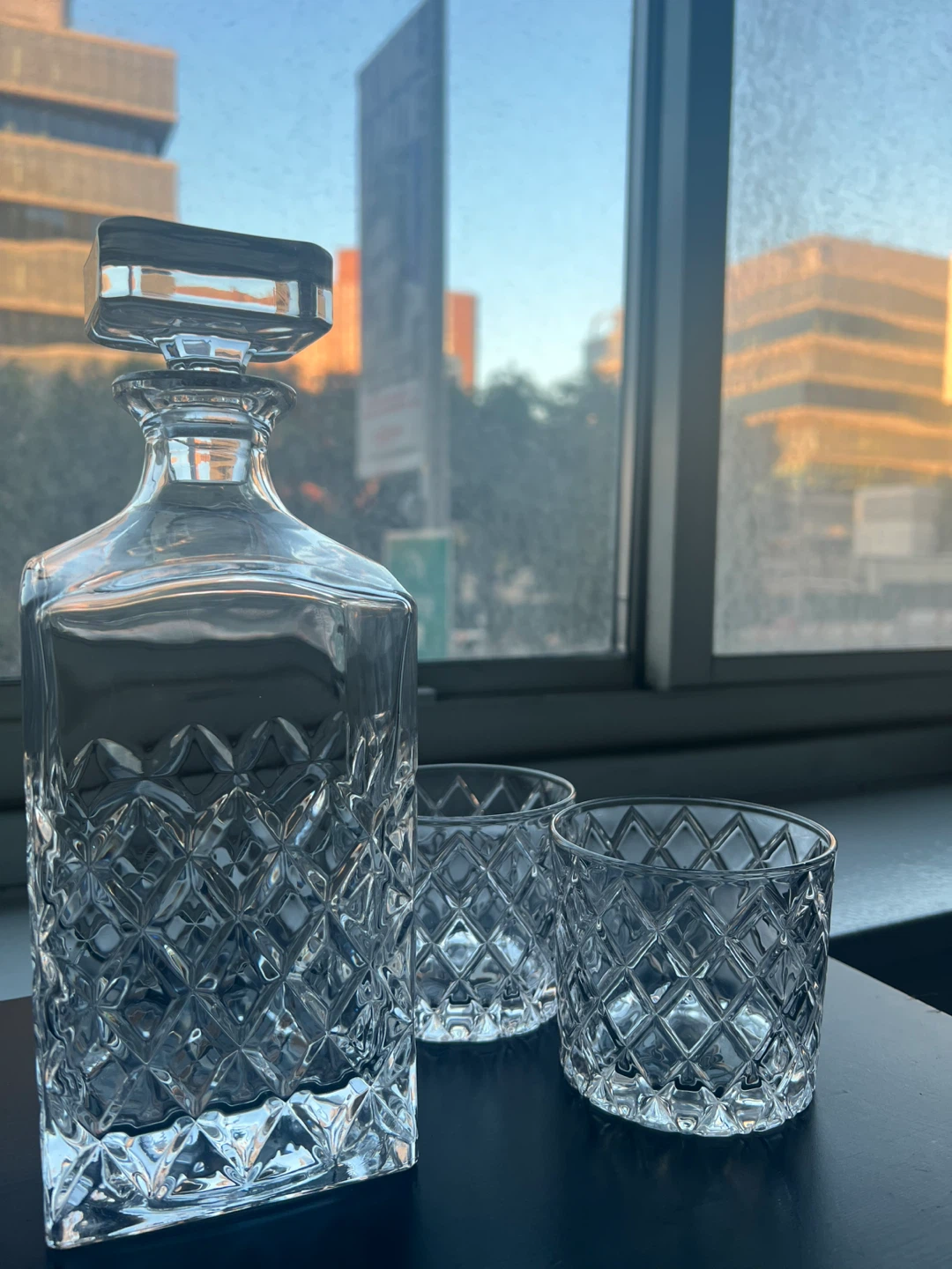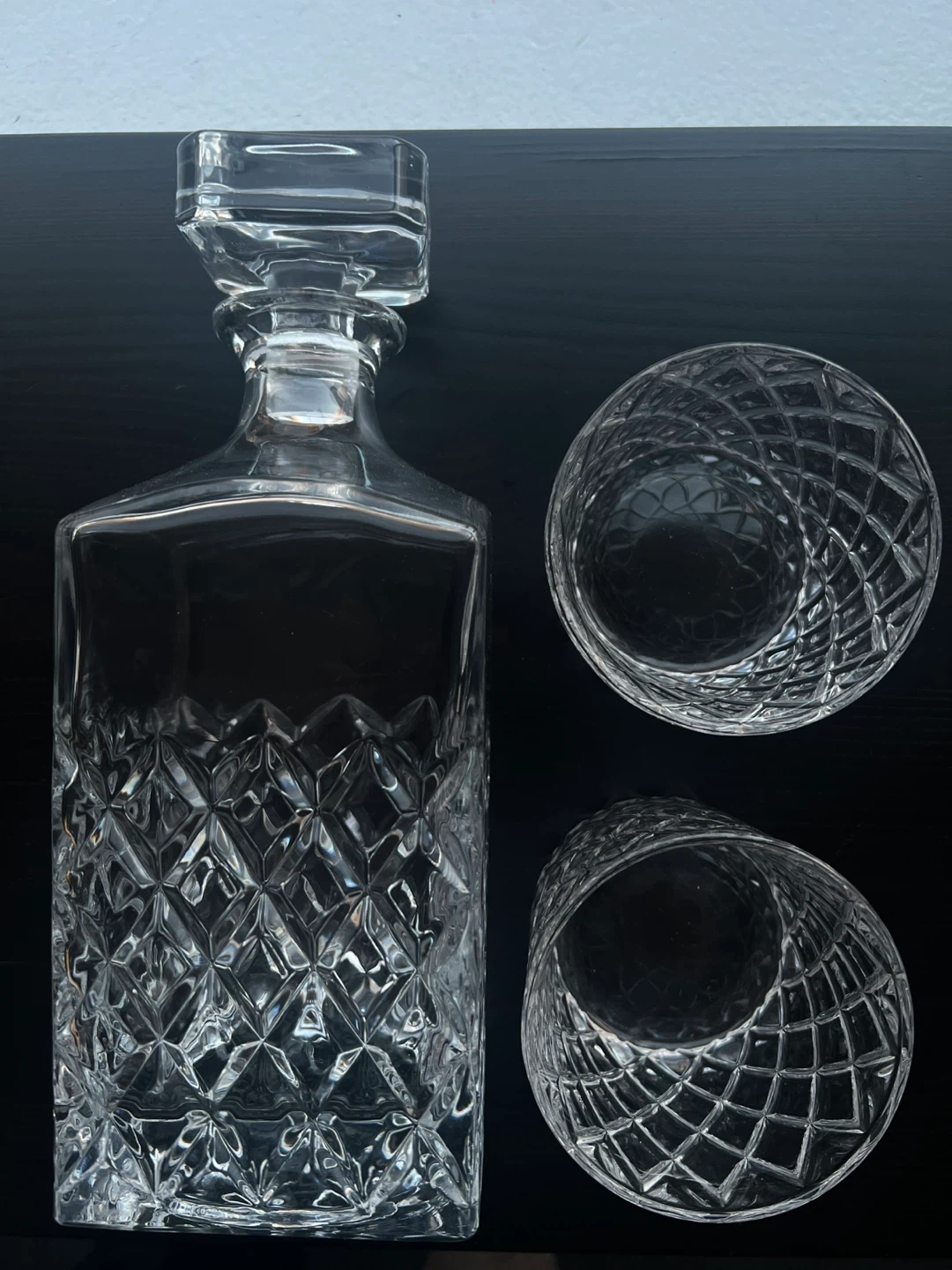 Selling a beautiful decanter with two matching glasses from CB2The set features a lovely diamond pattern. Perfect for adding a touch of elegance to your home bar or as a gift!