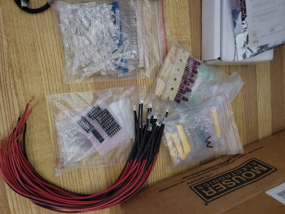 Perfect for students and hobbyists, there hundreds of LEDs, at least a hundred RGB LEDs, resistors and capacitors of all types, an LCD module, some pics, a pic loader, two breadboards, a power supply, usb connectors, jumpers, buttons... Too much to list, have fun!