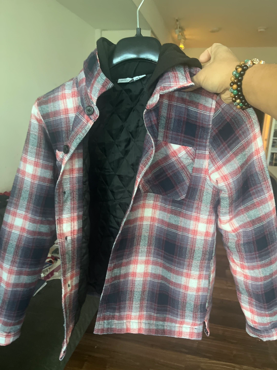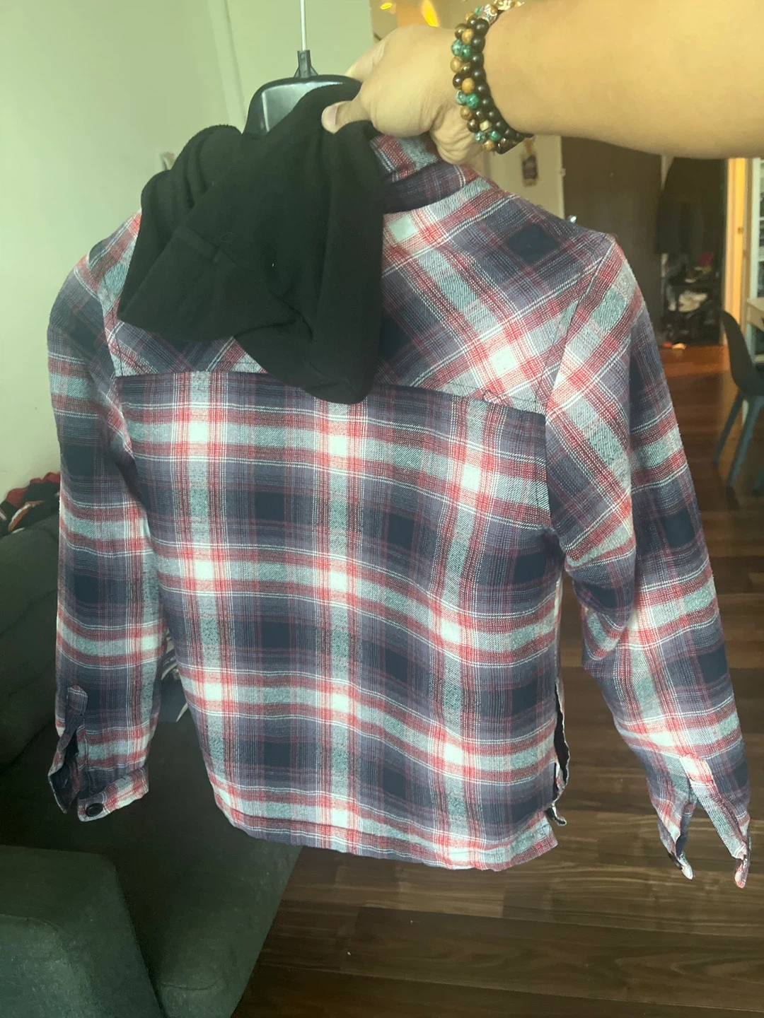 Selling a hooded plaid flannel shirt. It has a red, white, and navy blue plaid pattern with a black hood. Perfect for layering on cooler days!