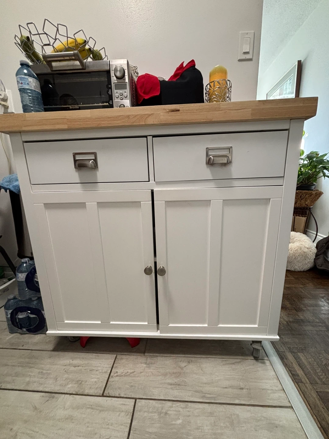 Selling a used IKEA Stenstorp kitchen cart. It's in good condition and has lots of storage with two drawers and a cabinet. Perfect for adding extra counter space and storage to your kitchen!