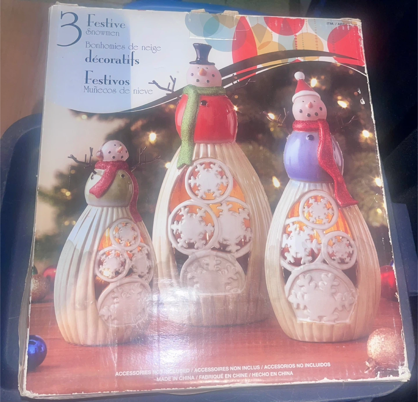 Selling a set of 3 festive snowmen decorations with LED lights! They are handpainted and require 2 AA batteries (not included). These are for decorative indoor use only and are not toys. Comes with the original box