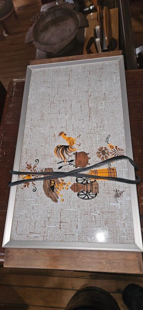 Selling a vintage serving hot tray with a charming rooster and cart design. It has a textured surface and a silver-tone frame. Perfect for adding a touch of retro flair to your home and for keeping your food warm!