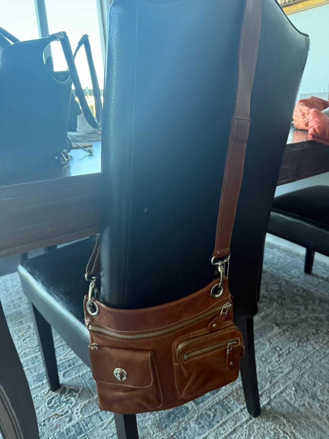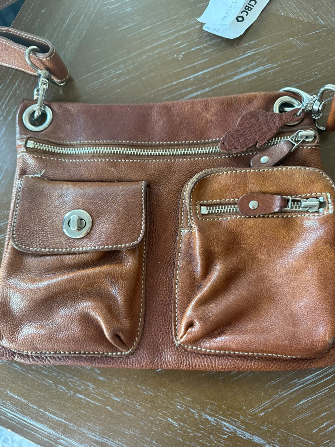 Selling a gently used Roots genuine leather shoulder bag in brown. It has a classic design with multiple pockets and a comfortable shoulder strap. Perfect for everyday use!