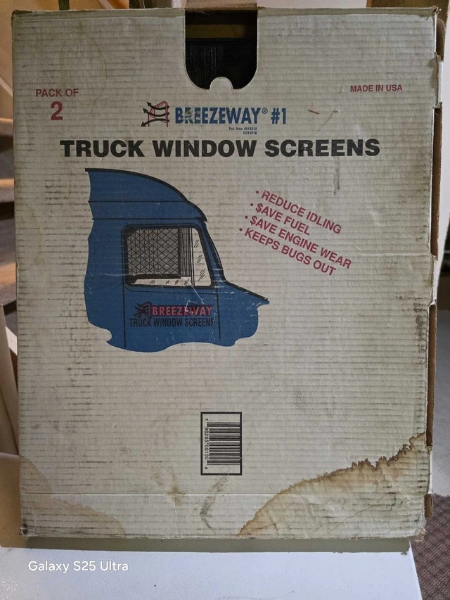 Keep those pesky bugs out of your truck with this pack of Breezeway #1 truck window screens! These screens are designed to reduce idling, save fuel, and minimize engine wear while keeping your cab bug-free. Please note, these are used screens, showing signs of wear on the packaging, but the screens themselves are in good condition and ready to install. Here are the specs: * Brand: Breezeway * Model: #1 * Type: Truck Window Screens * Quantity: 2 screens Given the condition, I'm pricing them at a reasonable $30.00. If you're reading this, the screens are still available!