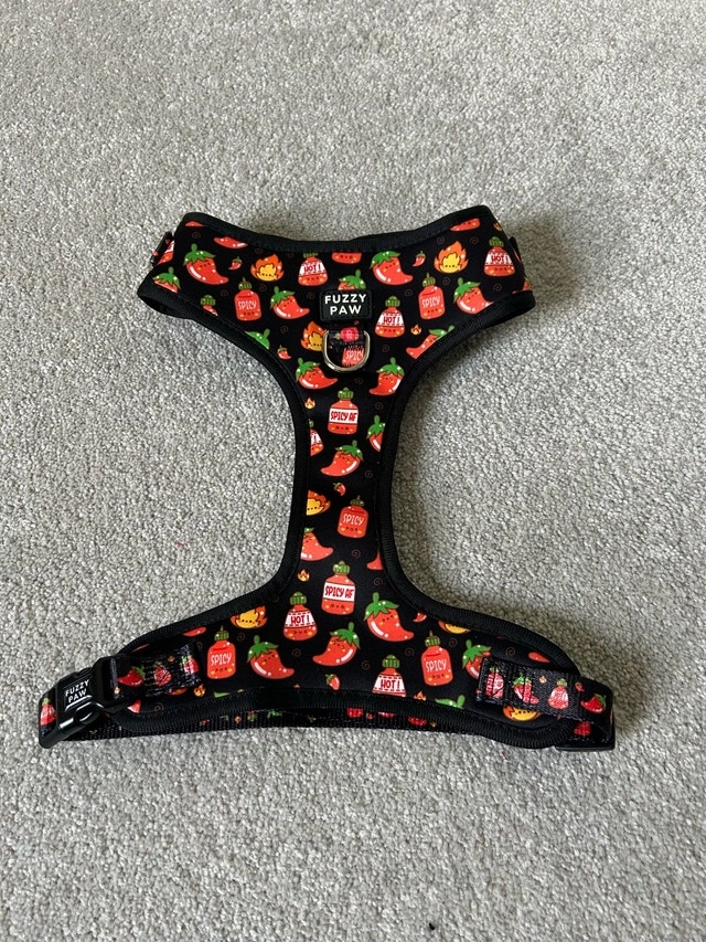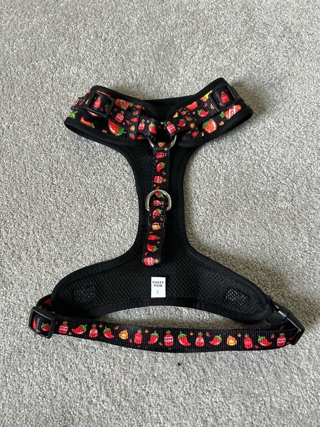 Spice up your pup's wardrobe with this Fuzzy Paw dog harness in a size large, featuring a playful chili pepper design! This harness is brand new in bag, ready for your furry friend's next adventure. * Brand: Fuzzy Paw * Size: Large * Design: Chili Pepper