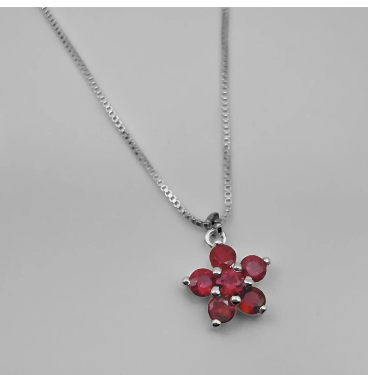 This is a beautiful flower necklace with ruby-coloured stones. It features a delicate silver chain and a flower-shaped pendant. It's in great condition and would make a lovely addition to any jewellery collection!