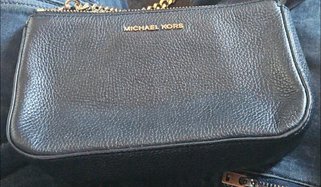 This is a cute black leather wristlet clutch from Michael Kors! It's perfect for carrying your essentials when you don't want to carry a big purse. It has a gold chain detail.