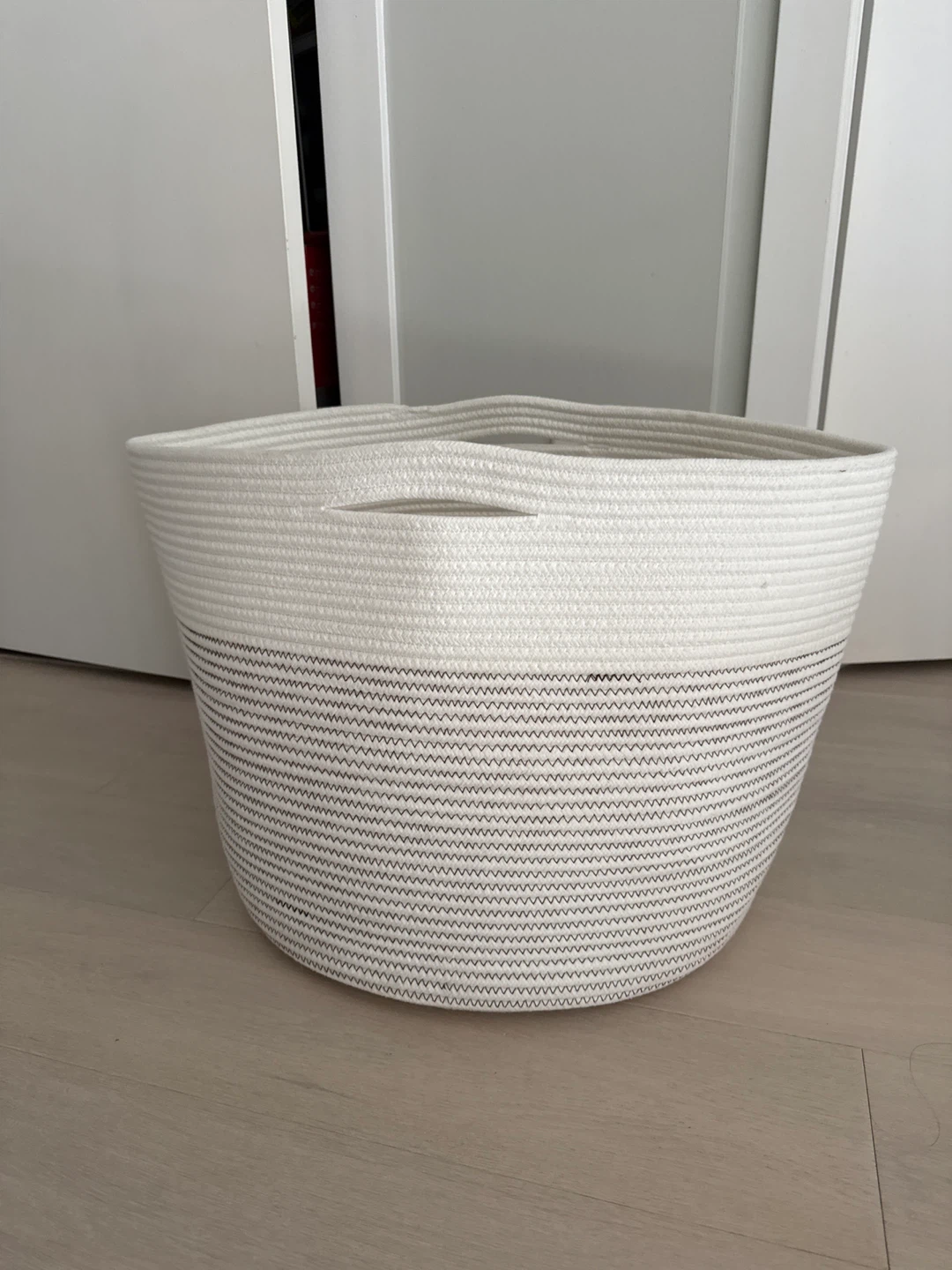 Here's a lovely woven cotton rope storage basket! It features a simple, neutral design in white and grey. Perfect for organizing toys, laundry, or towels. It's in great condition and ready for a new home!