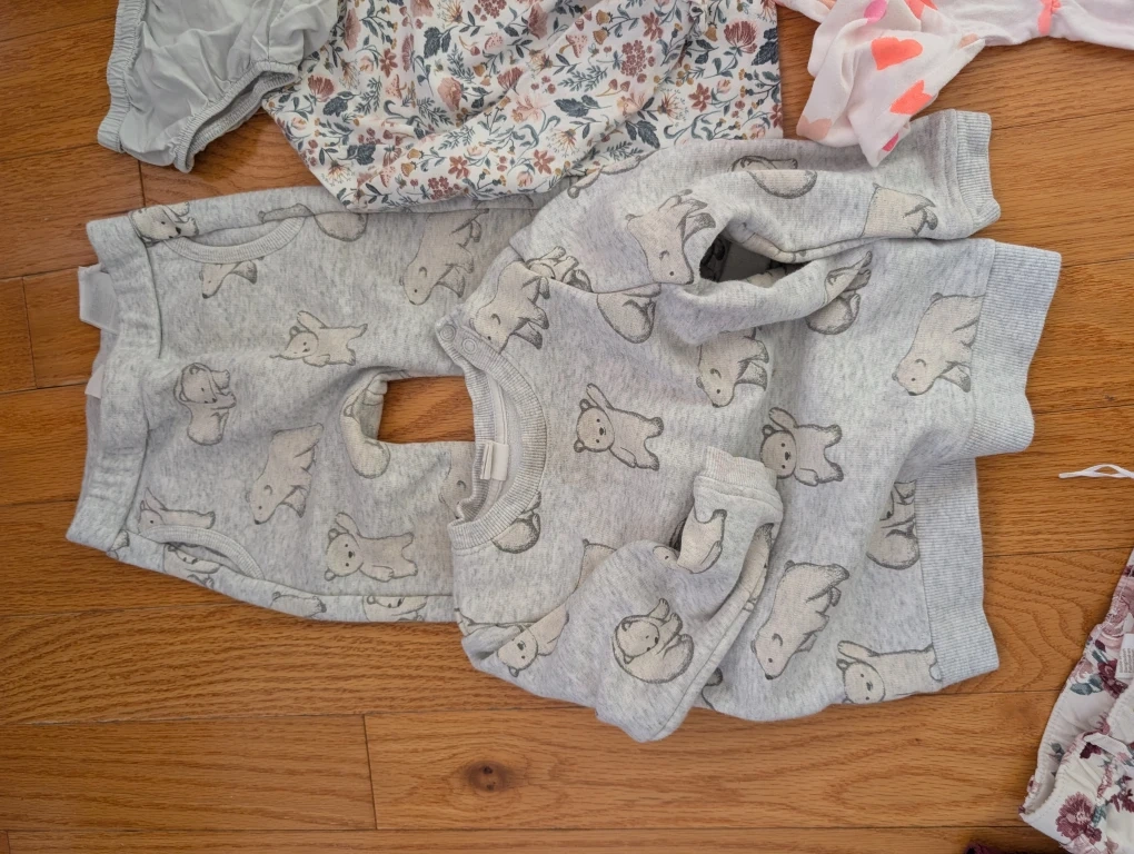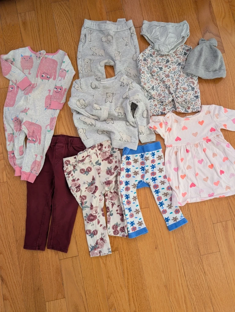 Includes onesie, 3 leggings, a heart-patterned dress, bear patterned set, panties, beanie, long sleeve t-shirt. The price is for the whole bundle (10 items)
