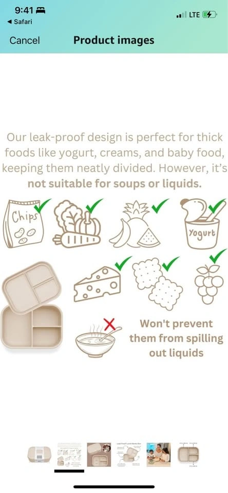 Perfect for thick foods like yogurt, creams, and baby food, this bento box keeps everything neatly divided. However, it's not recommended for soups or liquids, as it won't prevent them from spilling.