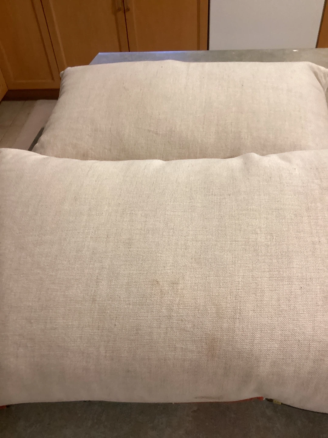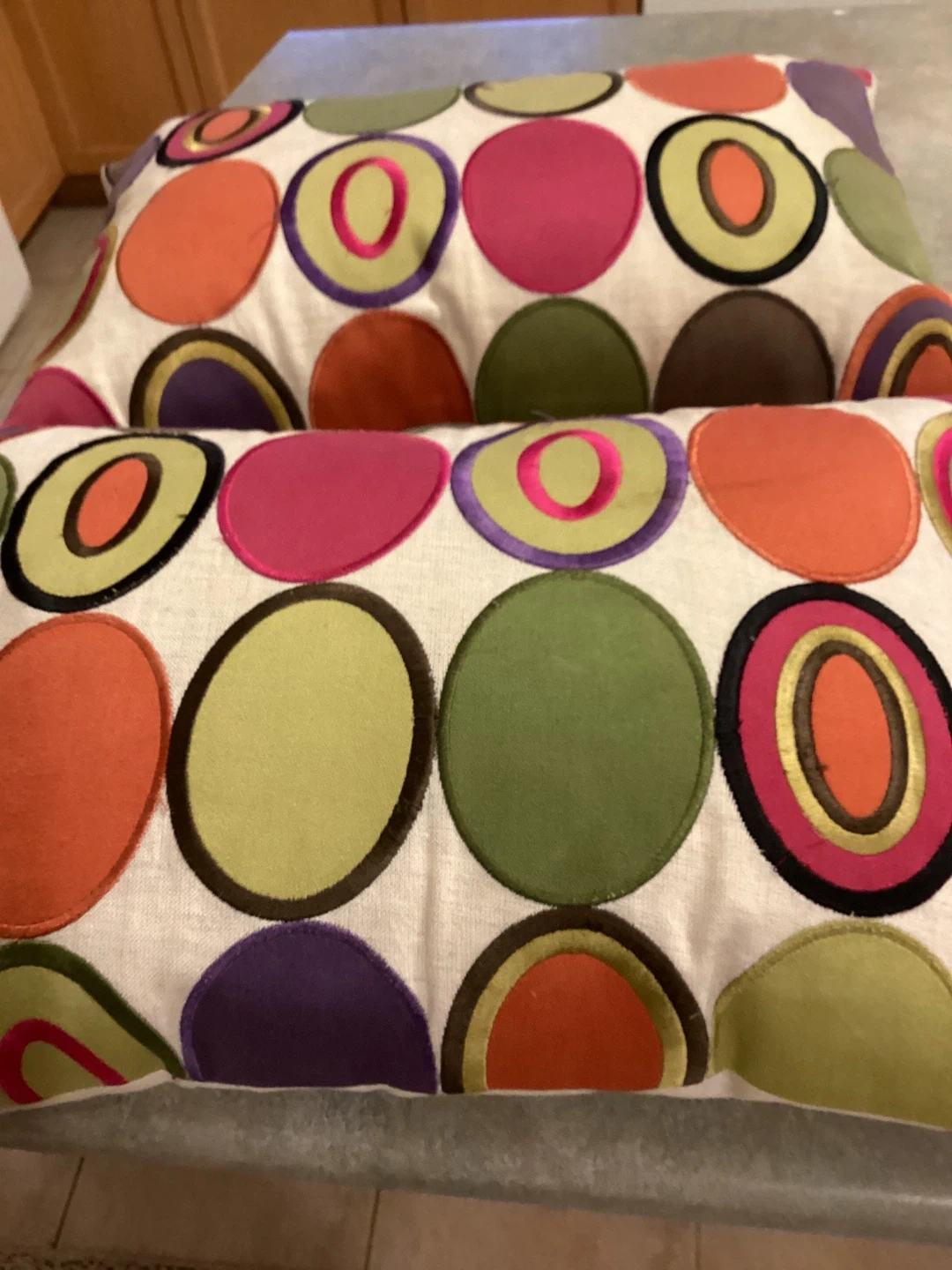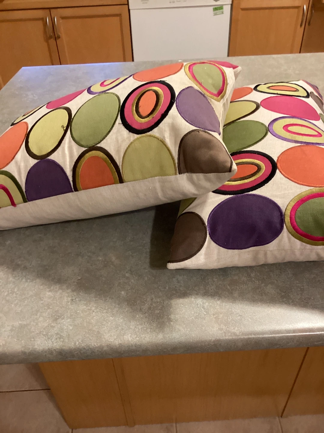 Selling a set of two decorative throw pillows! They feature a colourful circle design on one side and a plain cream colour on the other. They're in great condition and would add a fun pop of colour to any room