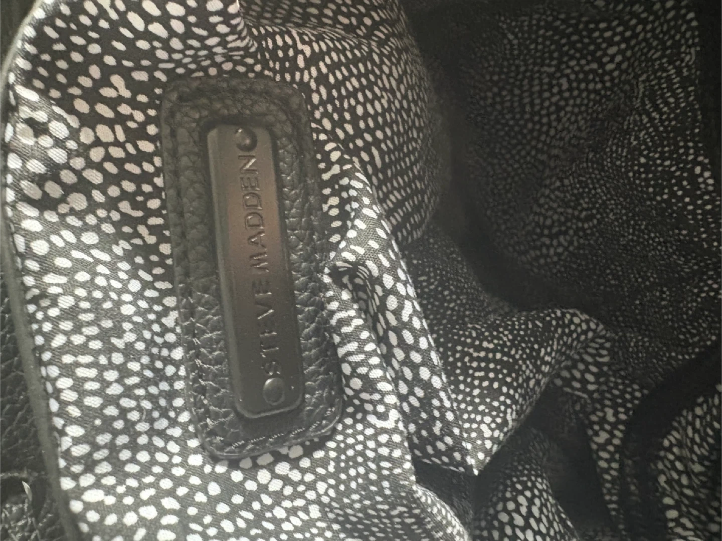 Selling a black Steve Madden backpack. It's in great condition and has a unique perforated design. The interior lining features a fun black and white pattern. Perfect for everyday use or travel!