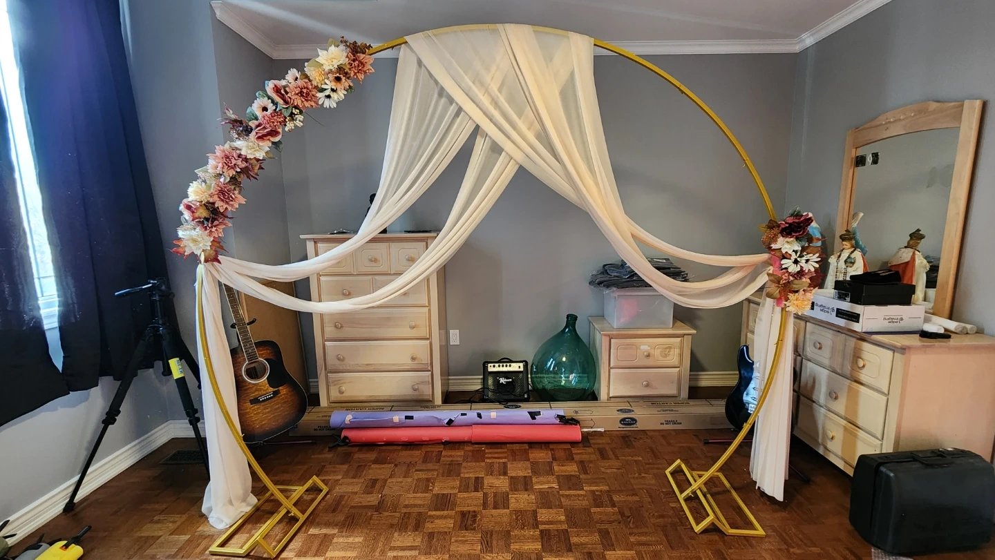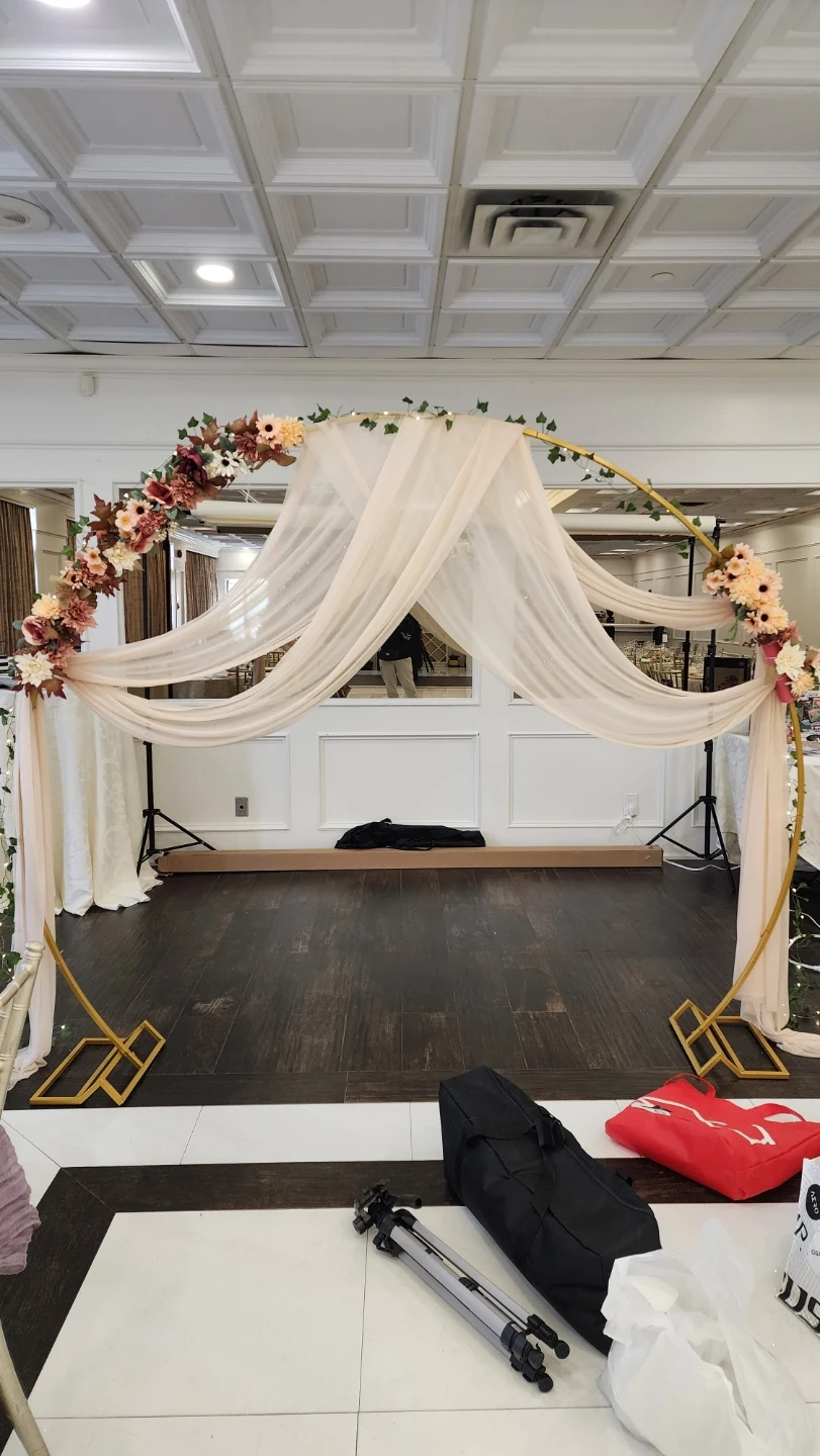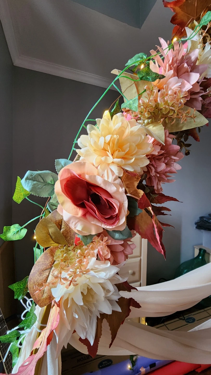 Selling floral decorations and drapes for a wedding arch. It's perfect for adding a touch of elegance to your special day. The floral decor is hot glued to pool noodles that you wrap around an arch pole and tie to secure. The 2 drapes are champagne coloured, each one is 20ft long.