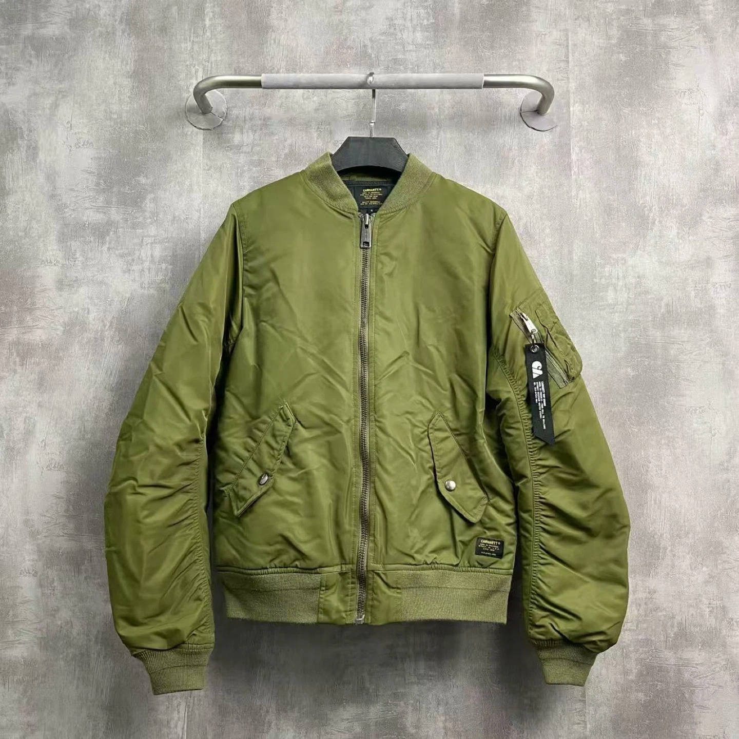 Selling a Carhartt WIP bomber jacket in olive green. It's in great shape and ready for a new owner! The jacket features a classic bomber design with a zip closure and multiple pockets. Perfect for adding a stylish touch to your wardrobe