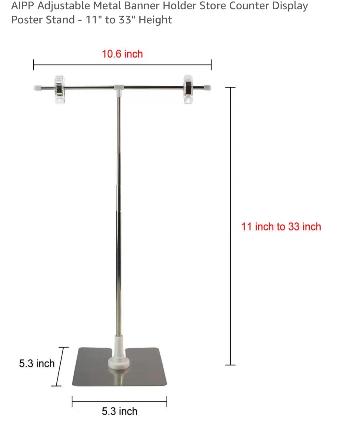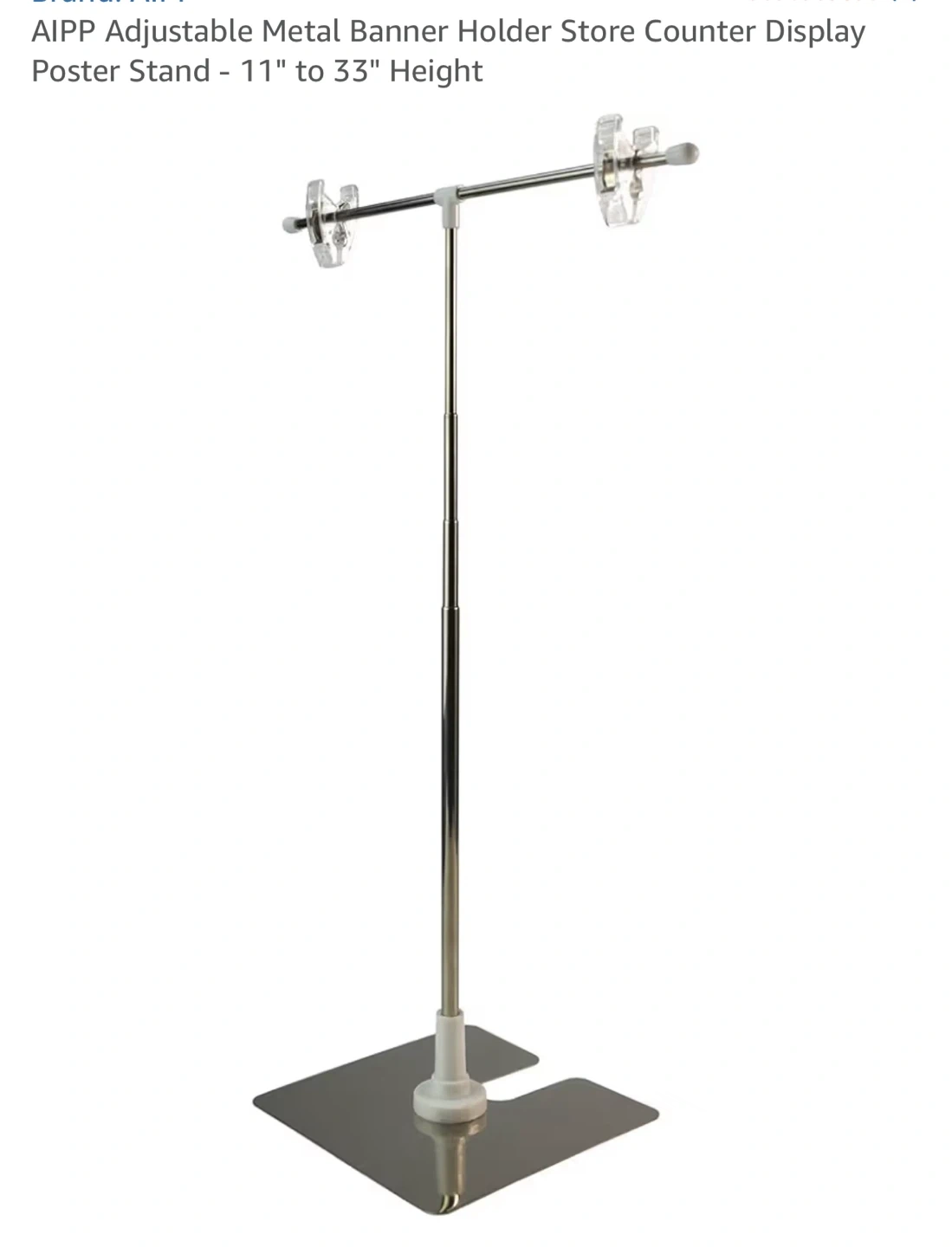 Selling an AIPP adjustable metal banner holder. It's perfect for store counter displays. The height is adjustable from 11 inches to 33 inches.