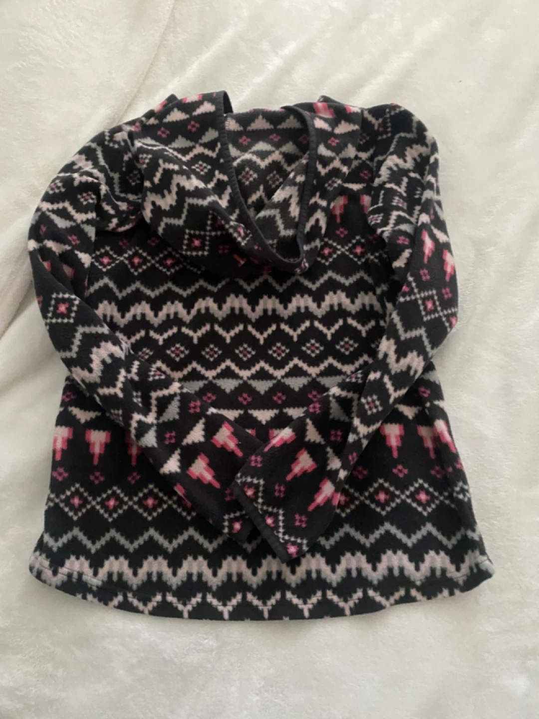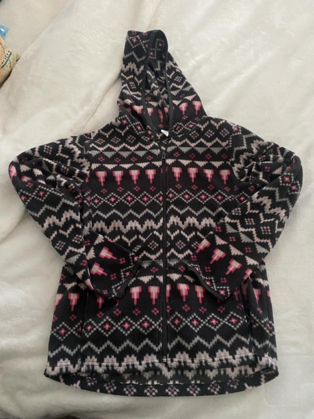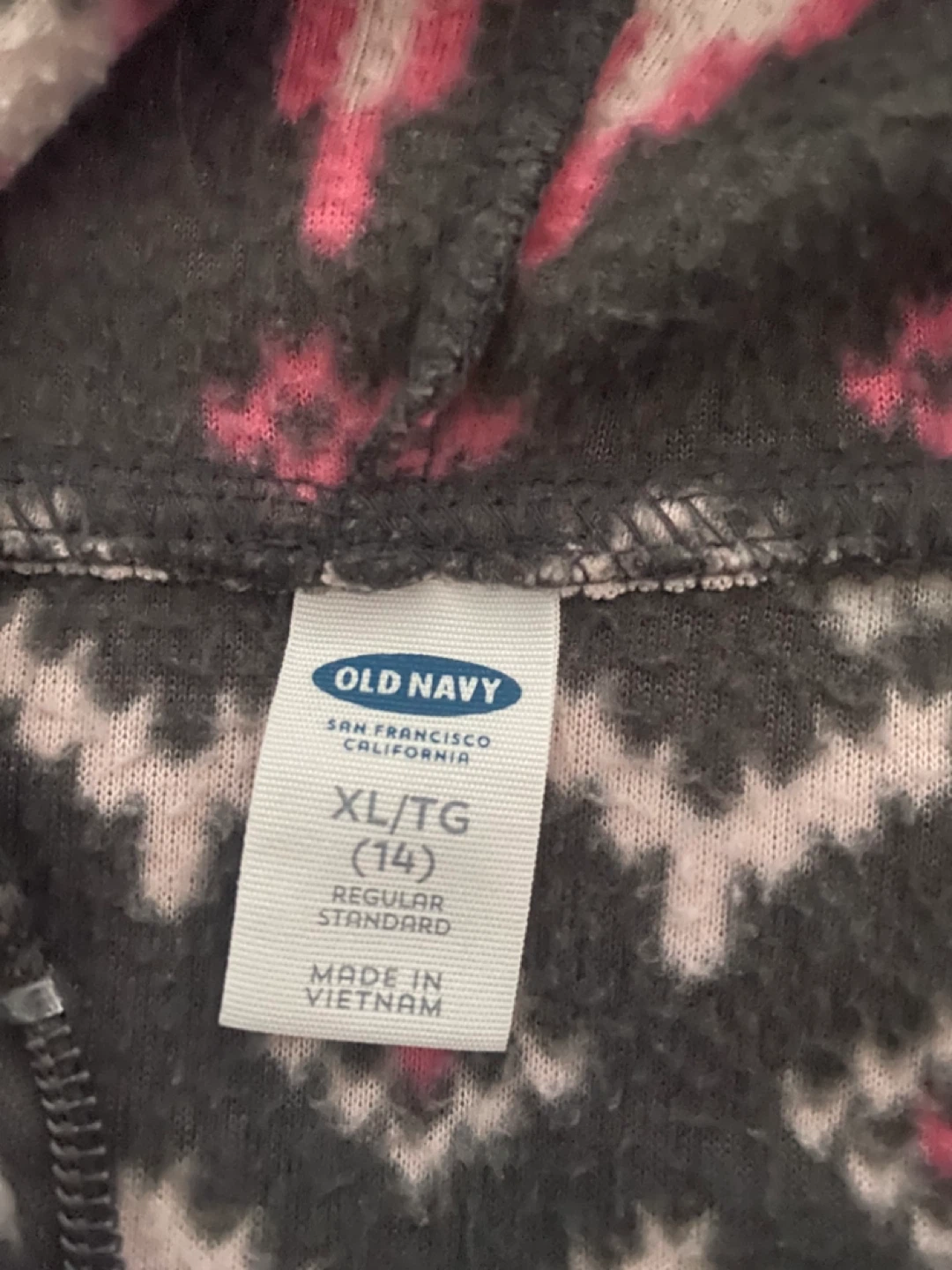 Cozy Old Navy fleece hoodie in size XL (14). The hoodie features a fun geometric pattern in black, pink, and grey. Perfect for staying warm on chilly days!