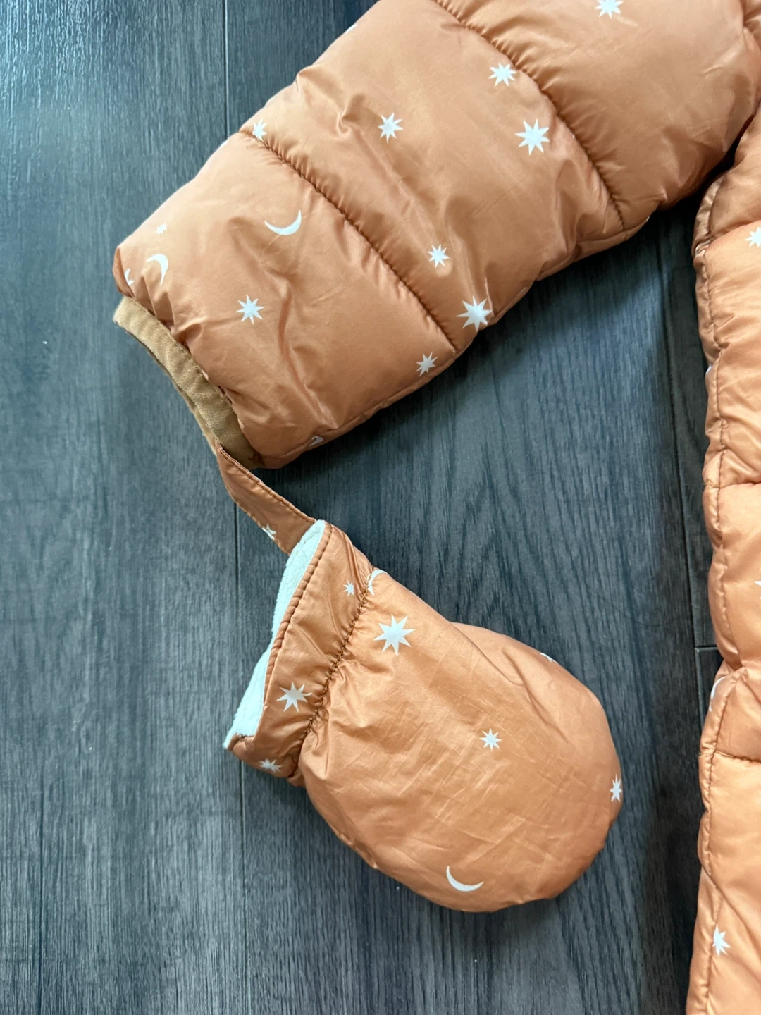 Cozy baby snowsuit in great condition! It comes with matching mittens and booties to keep your little one warm during the colder months. The suit features a hood and a zipper closure for easy dressing. The design has cute moons and stars