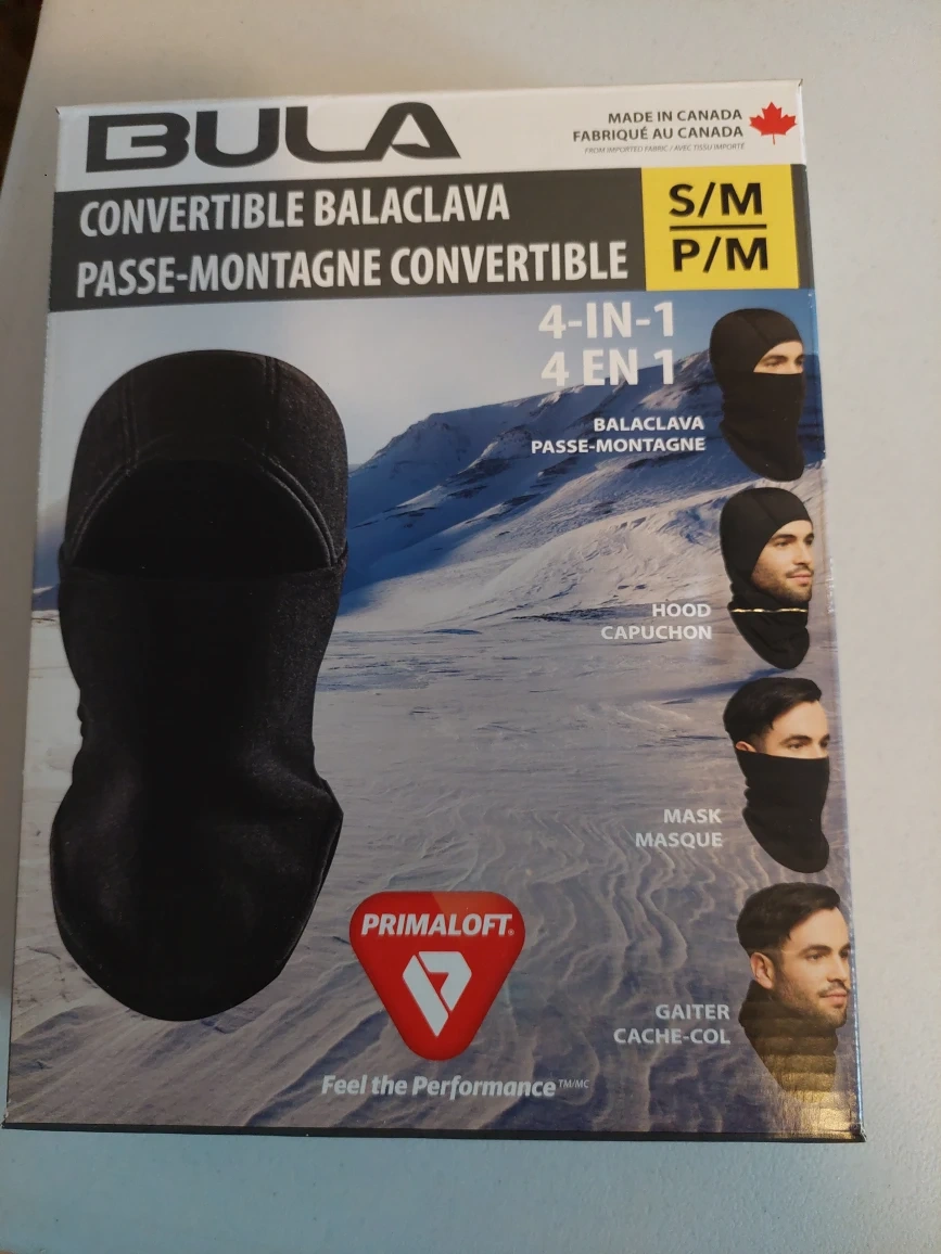 Selling a Bula convertible balaclava in size S/M. It's a 4-in-1 design that can be worn as a balaclava, hood, mask, or gaiter. Made in Canada from imported fabric, it features Primaloft insulation for performance