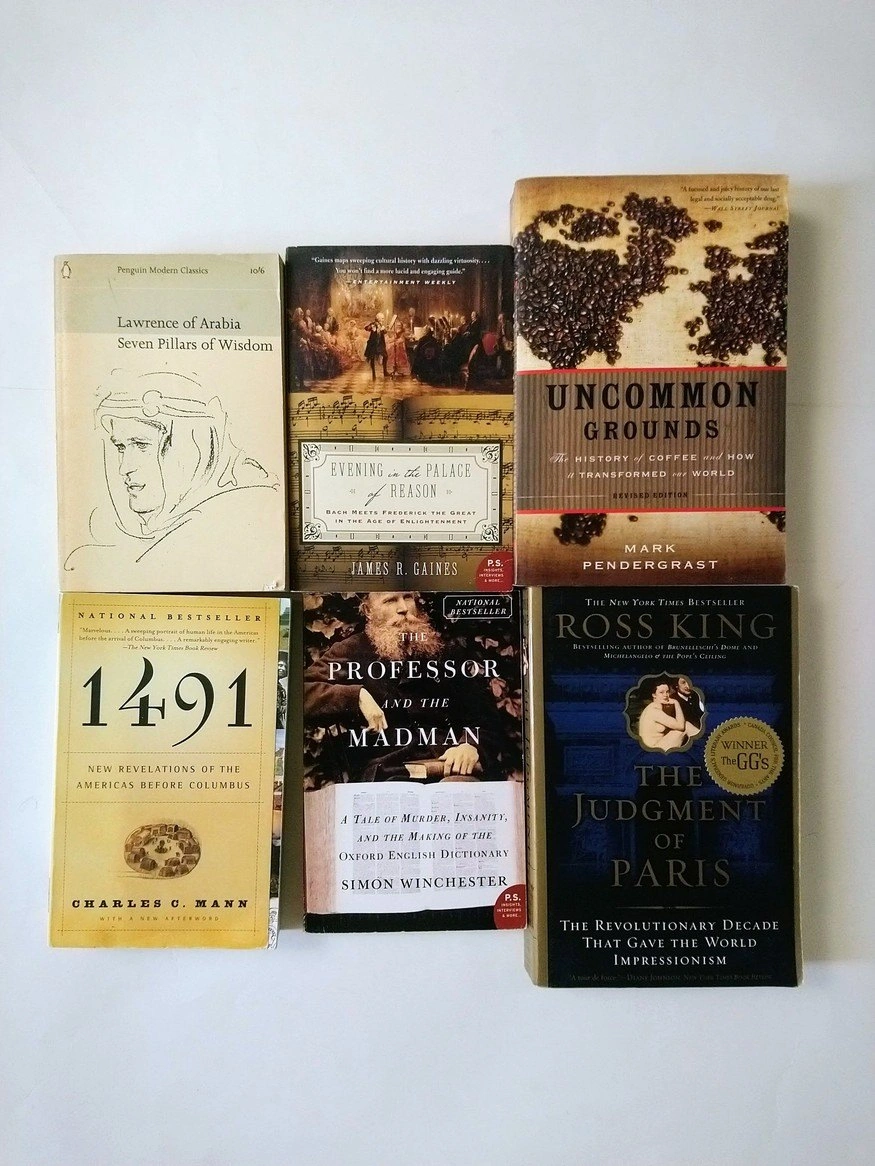 Location: Yonge and College /downtown Toronto $6 each. Cash only; prices are firm. - Seven Pillars of Wisdom - Lawrence of Arabia (T.E. Lawrence) - Evening in the Palace of Reason: Bach Meets Frederick the Great in the Age of Enlightenment - James R. Gaines - Uncommon Grounds: The History of Coffee and How It Transformed The World - Mark Pendergrast - 1491: New Revelations of the Americas Before Columbus - Charles C. Mann - The Professor and the Madman: A Tale of Murder, Insanity, and the Making of the Oxford English Dictionary - Simon Winchester - The Judgment of Paris: The Revolutionary Decade That Gave The World Impressionism - Ross King Feel free to check out my other book posts as well!