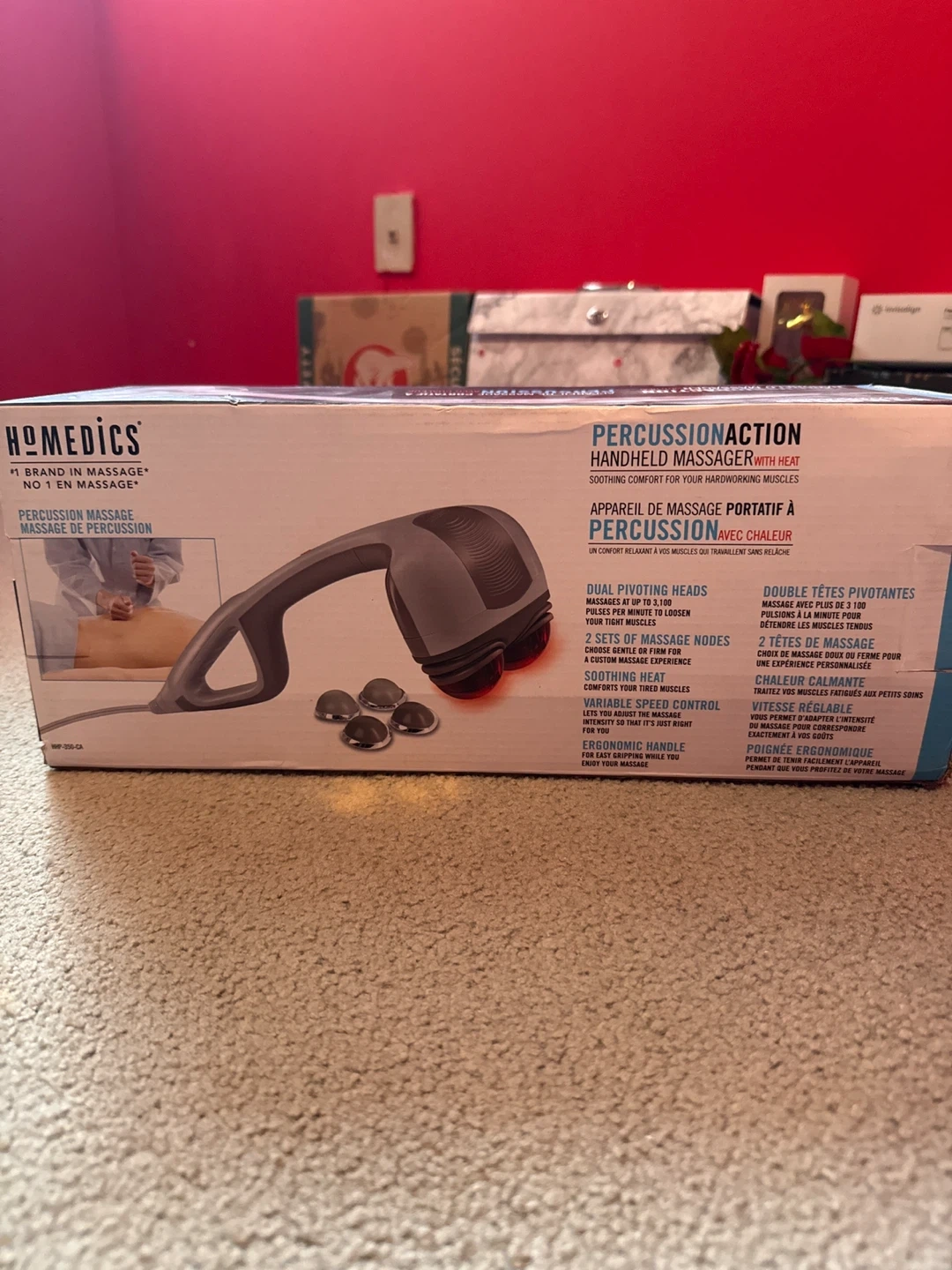 Selling a HoMedics Percussion Action Handheld Massager with Heat! It's designed to provide soothing comfort for your hardworking muscles. It features dual pivoting heads, massage nodes, soothing heat, variable speed control, and an ergonomic handle for easy use.
