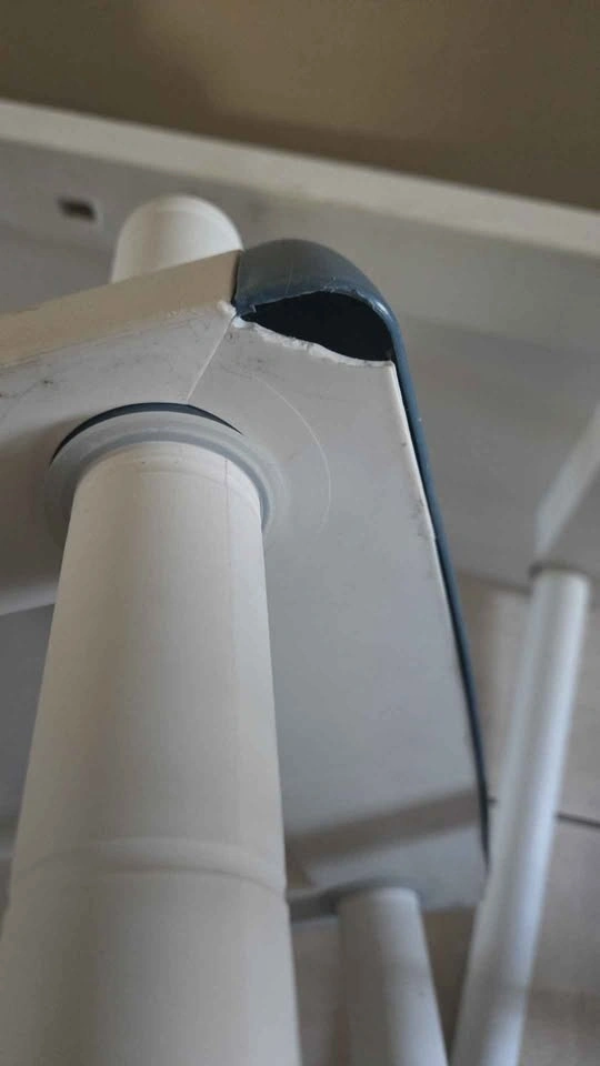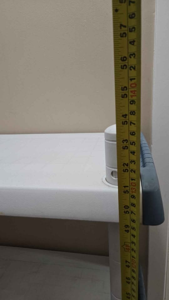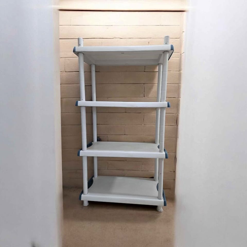 White 4-shelf storage unit. Shelves are 28.5 inches wide and 12.5 inches deep. Height is 53 inches. Has a little crack in the corner but doesn't affect the function and still has a lot of life left. Needs a little more cleaning as this was previously use to hold plants.