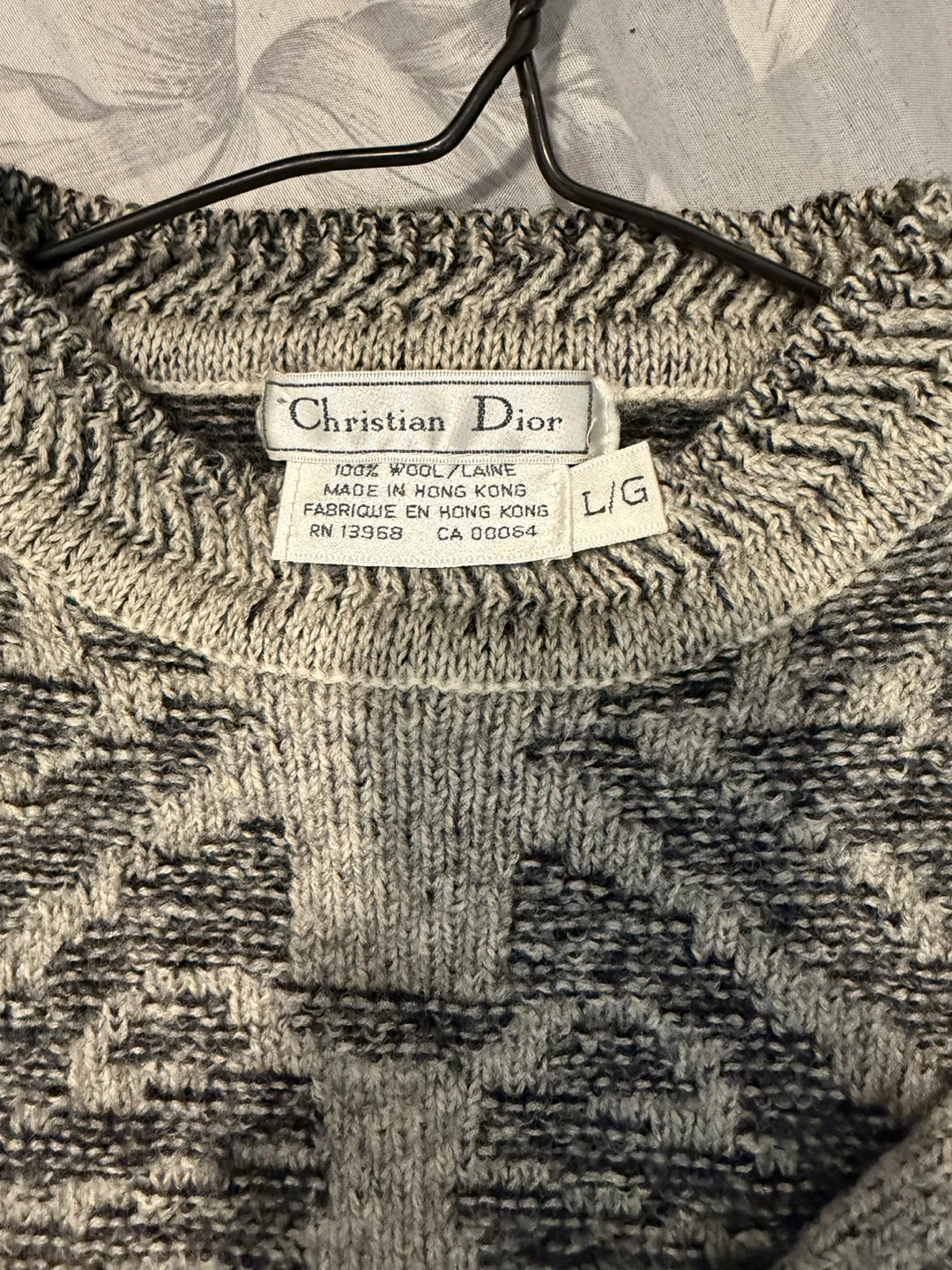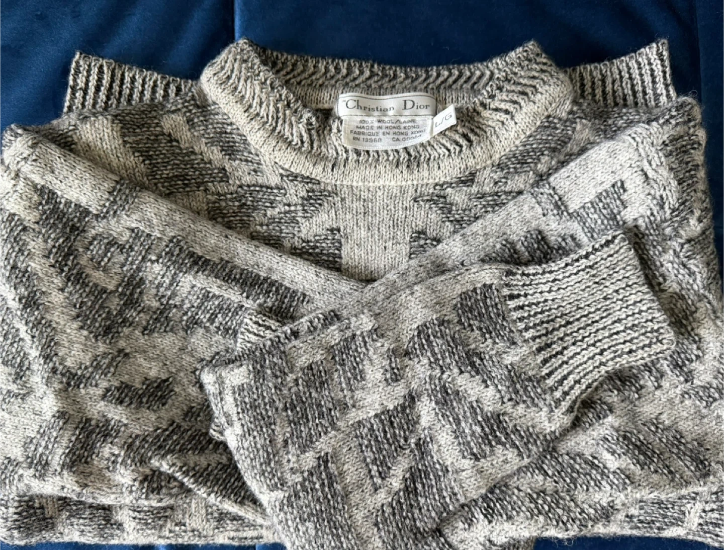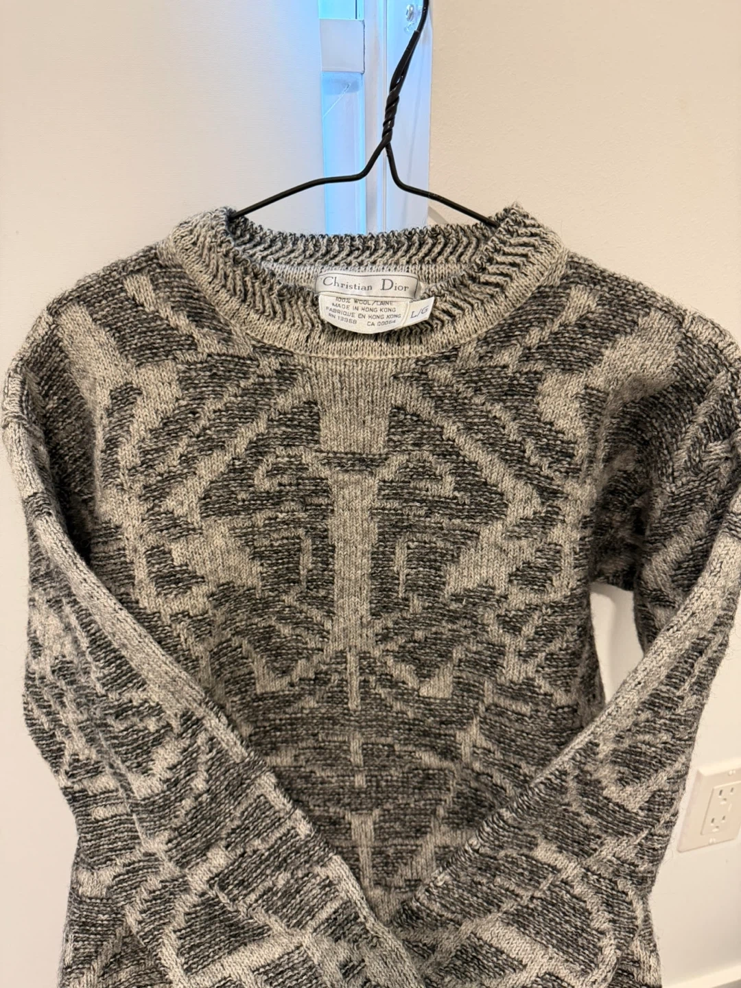Vintage Christian Dior sweater, likely of the 90s era. It's a size L/G and made of 100% wool. The sweater has a unique pattern in shades of grey and black. Perfect condition.