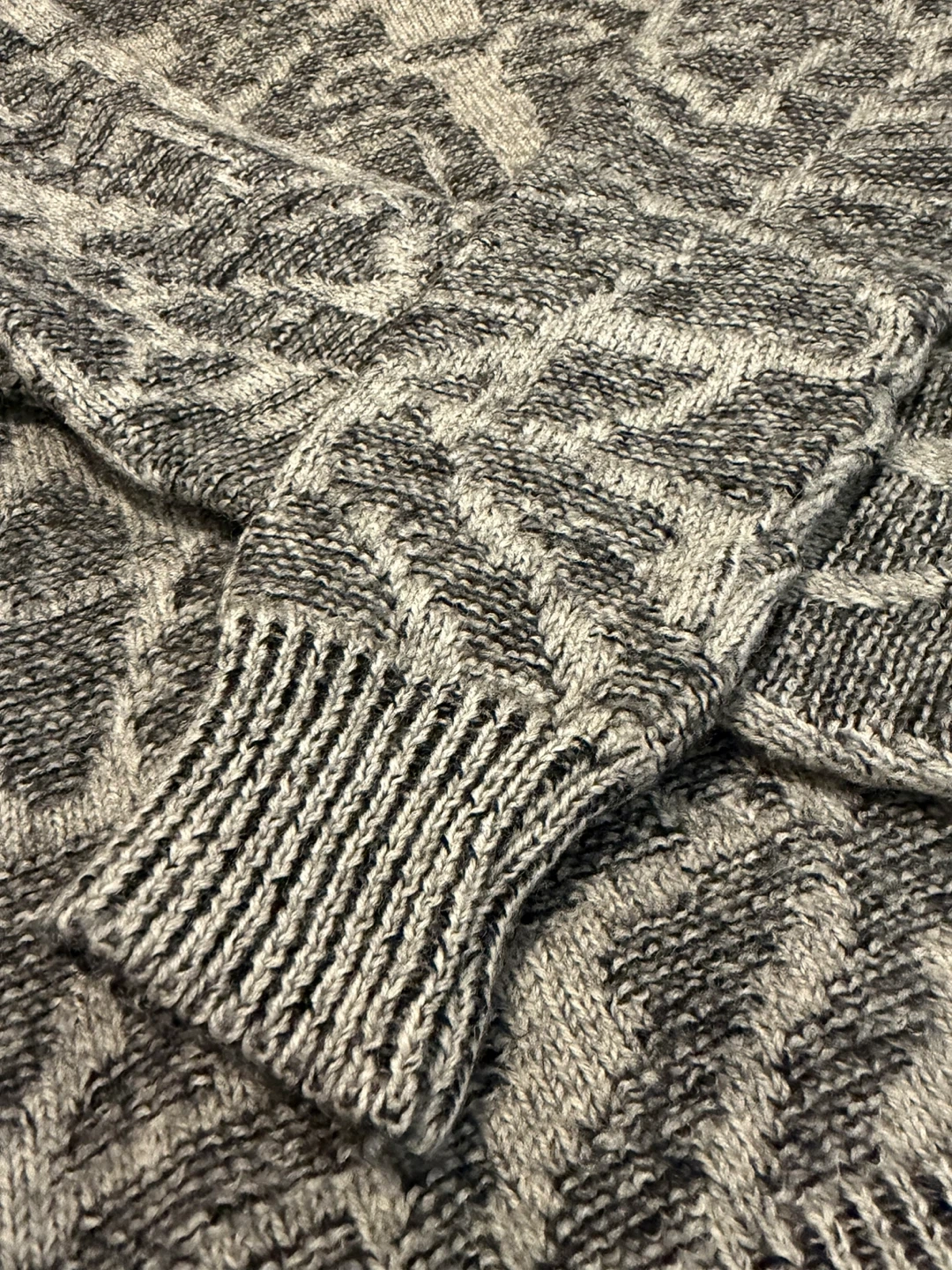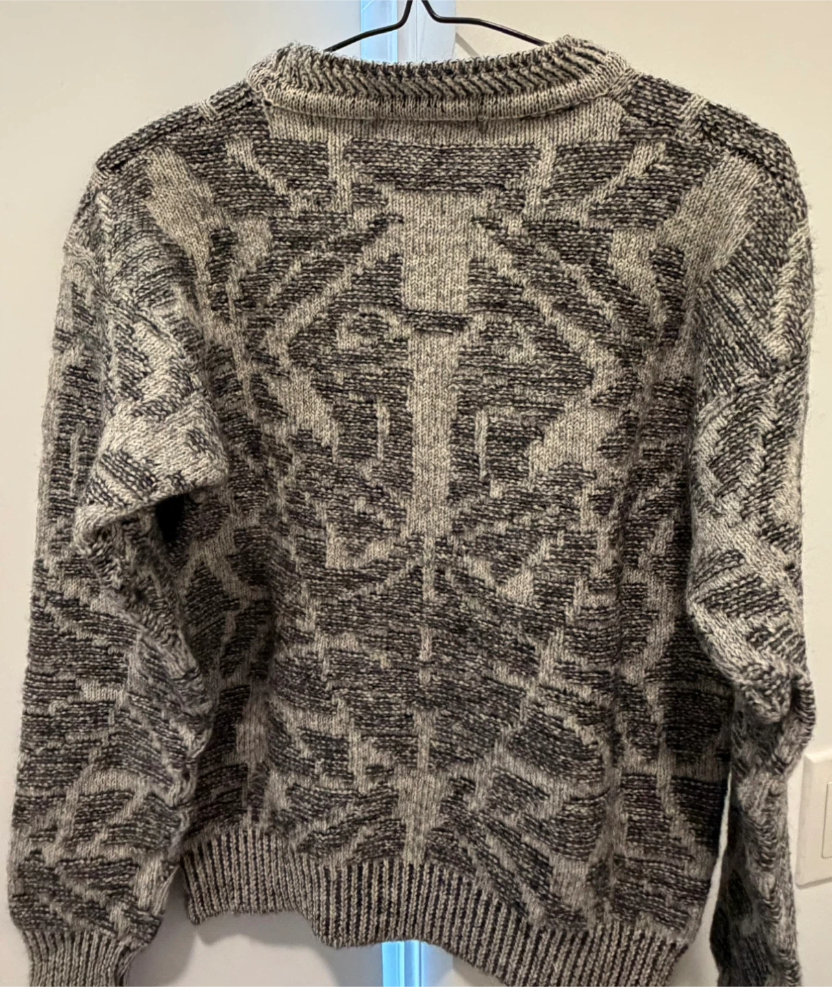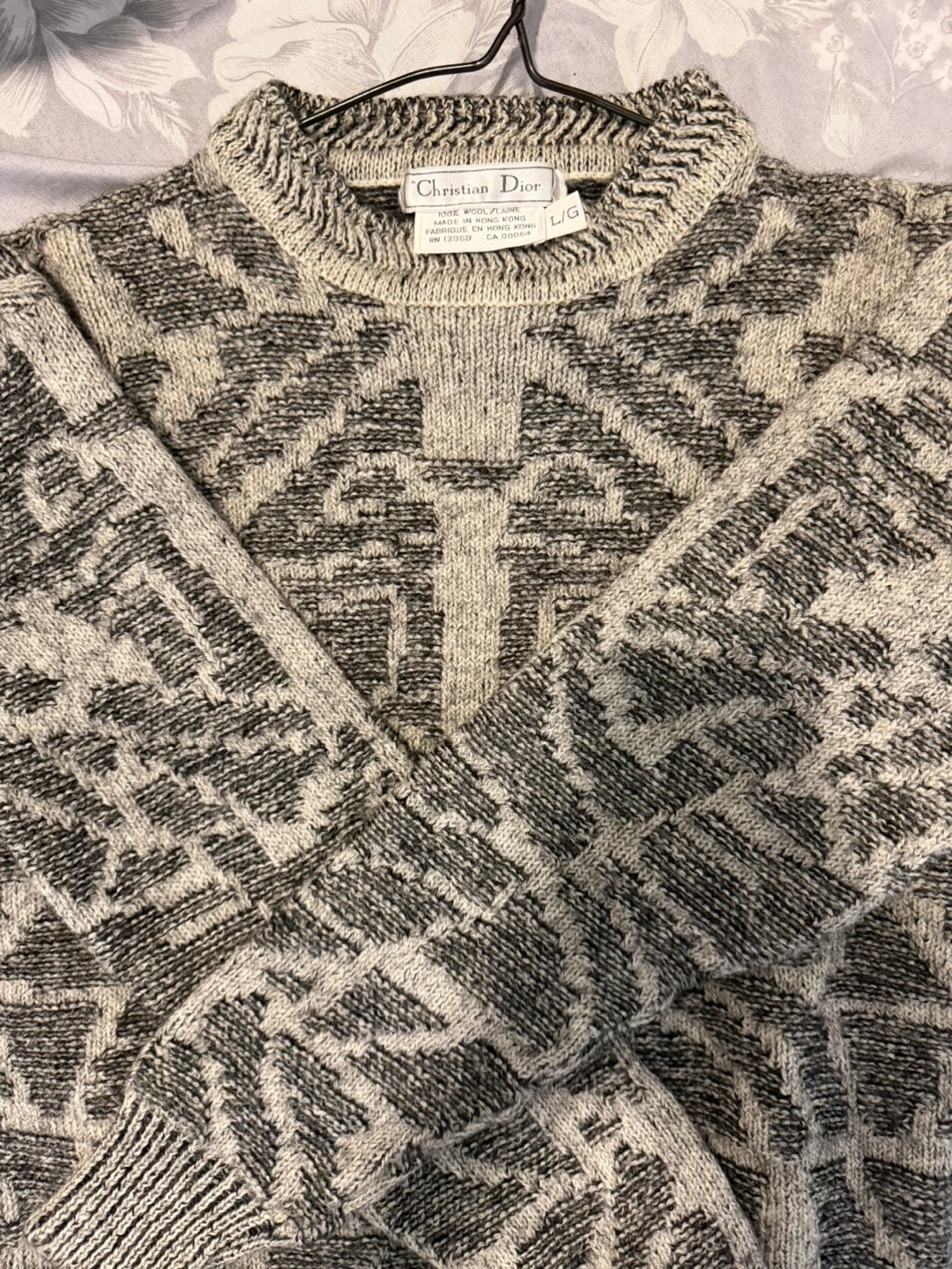 Vintage Christian Dior sweater, likely of the 90s era. It's a size L/G and made of 100% wool. The sweater has a unique pattern in shades of grey and black. Perfect condition.
