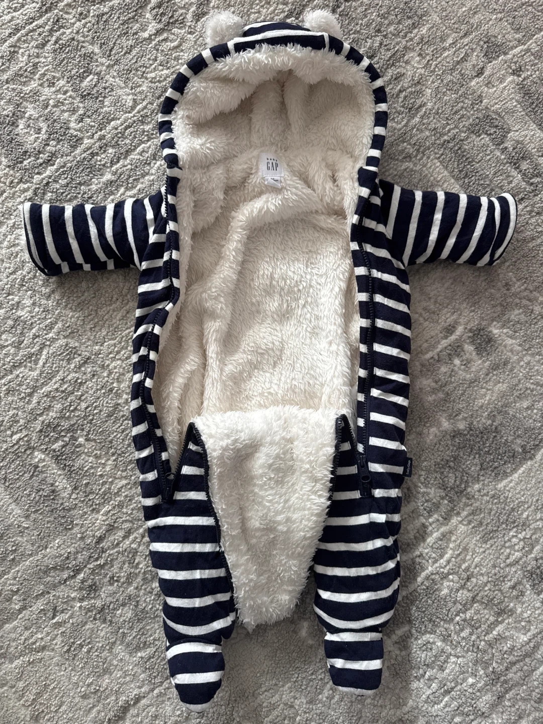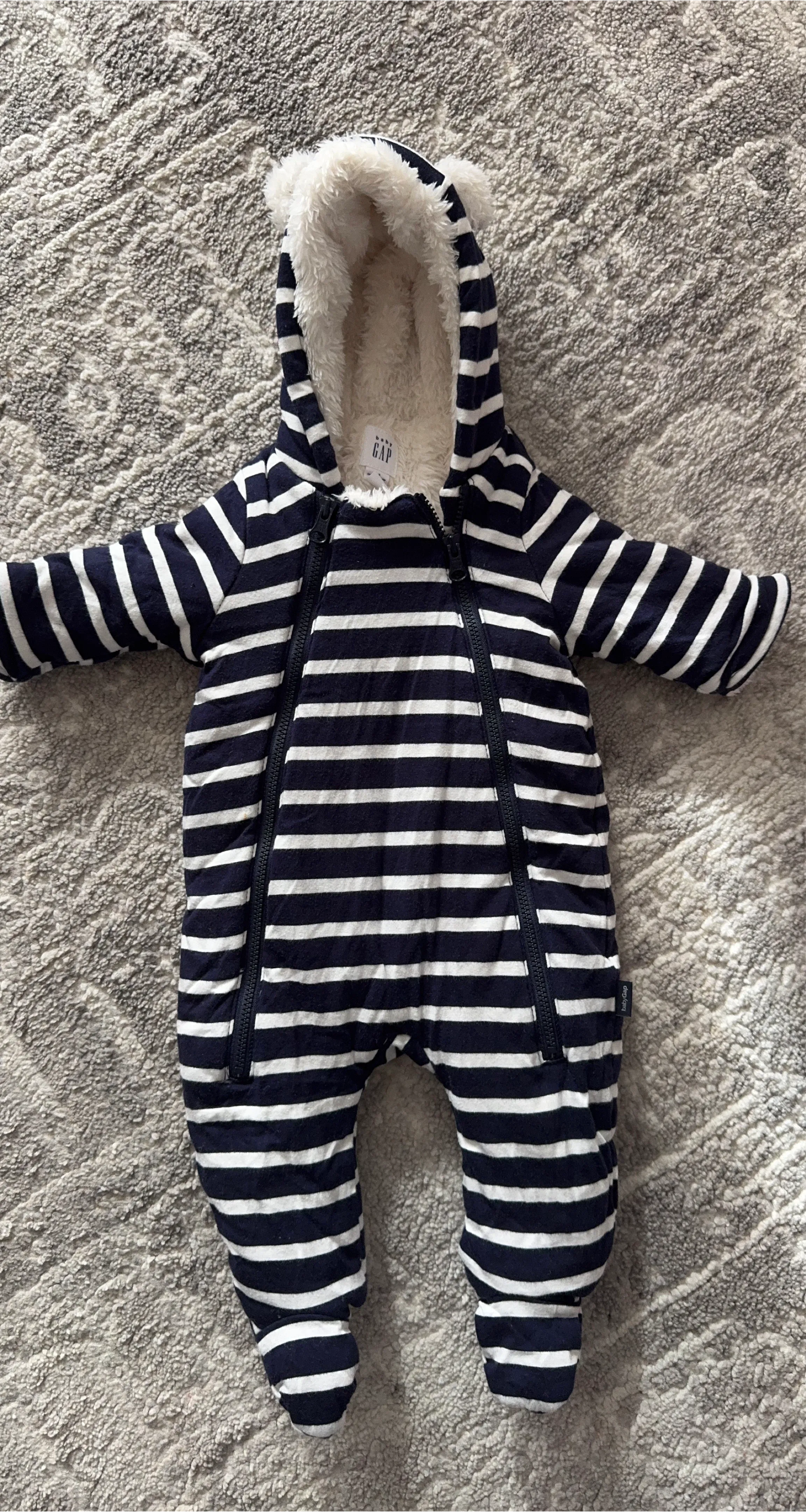 Keep your little one warm with this adorable Baby Gap snowsuit! It's in great condition and perfect for the colder months. The snowsuit features a cozy, soft lining and a cute striped design. Size is 0-3 months.