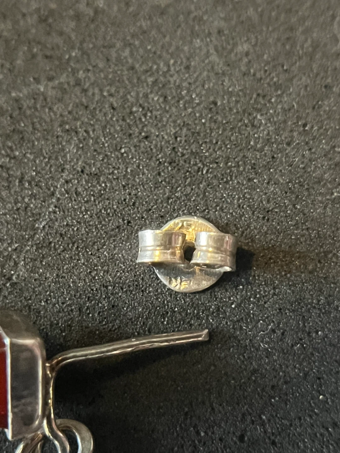 These are a pair of lovely amber drop earrings. They feature a rectangular amber stone set in a sterling silver frame. They're in great condition and ready to wear!
