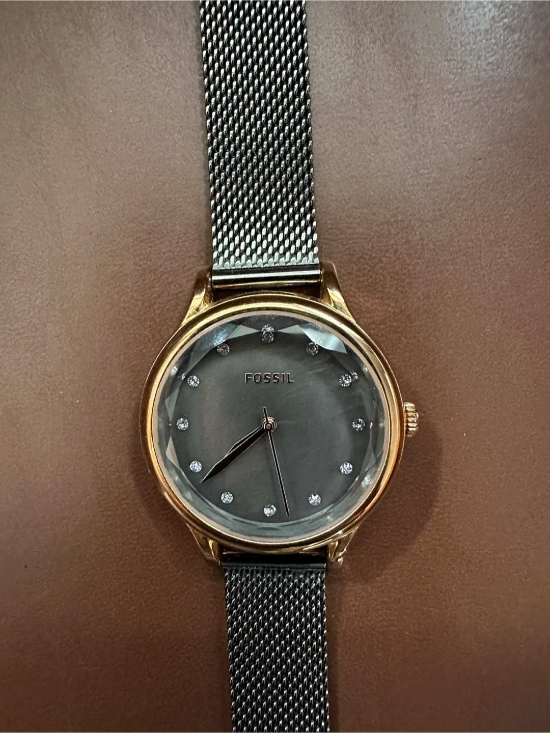 Selling a Fossil ladies' watch. It has a nice mesh band and a grey face with decorative stones. It's in great condition!