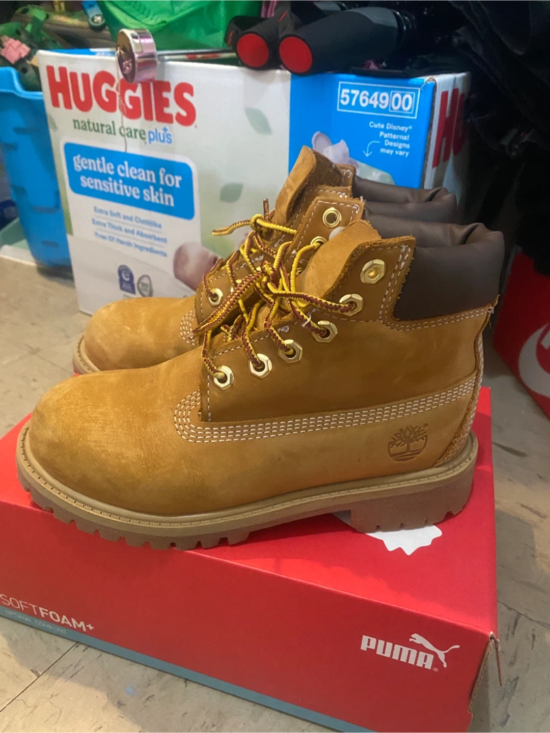 Selling a pair of Timberland toddler boots in size 1M. They are in good condition and ready for a new adventure! The boots are a classic wheat color and have the iconic Timberland design.