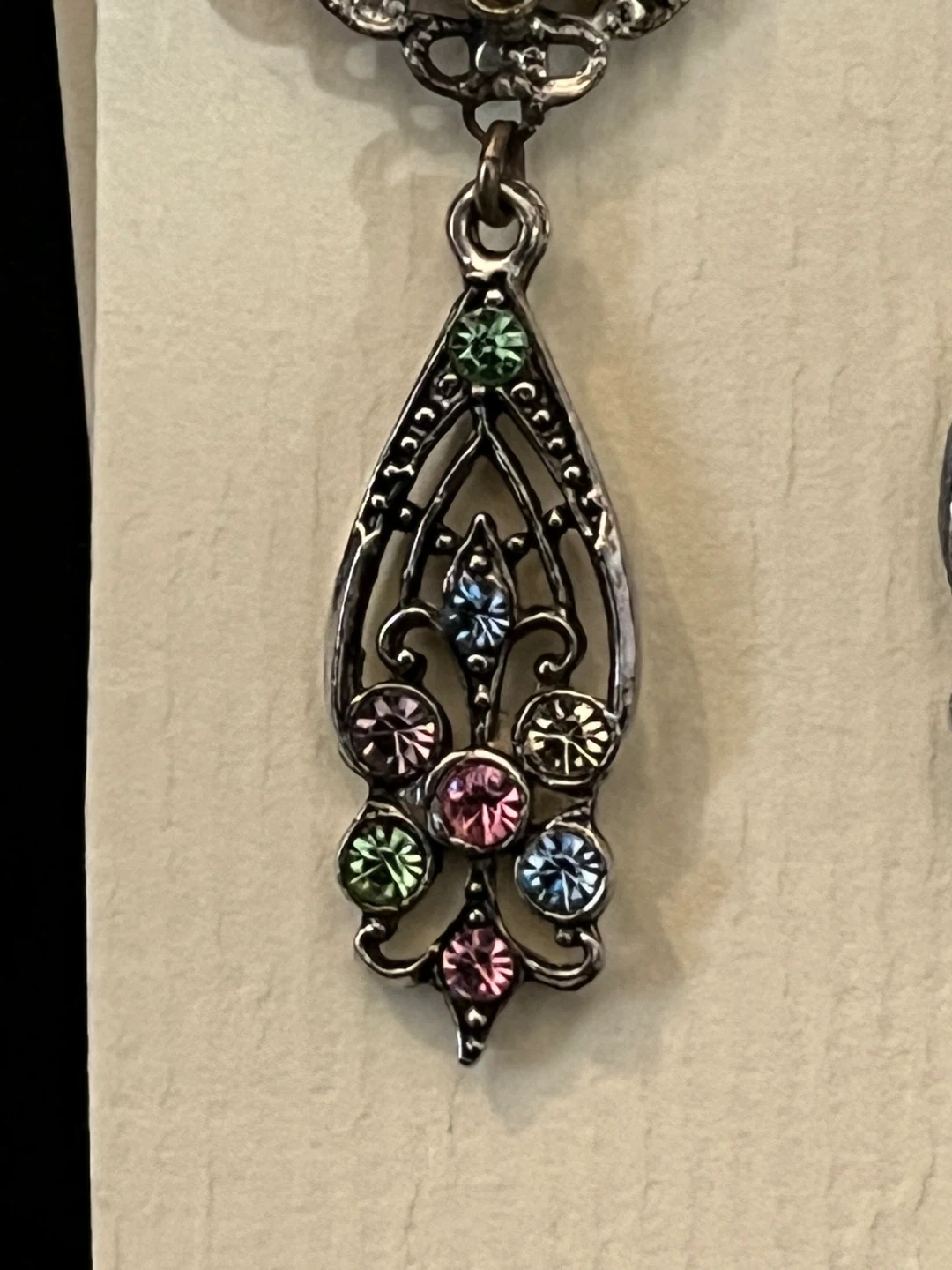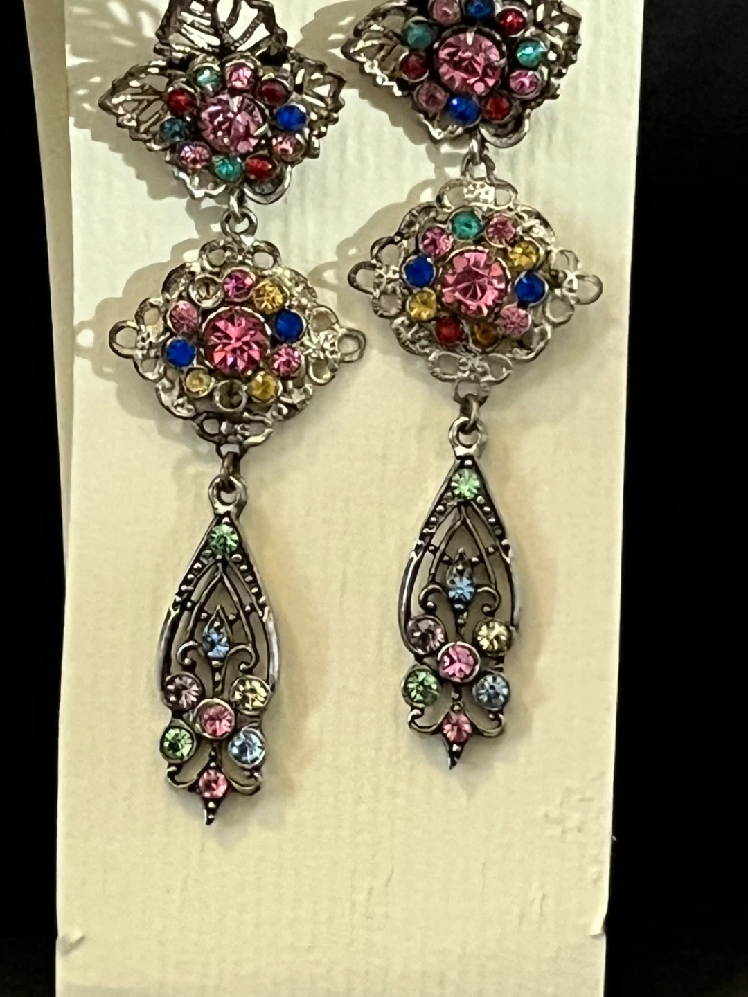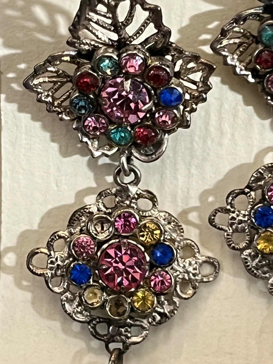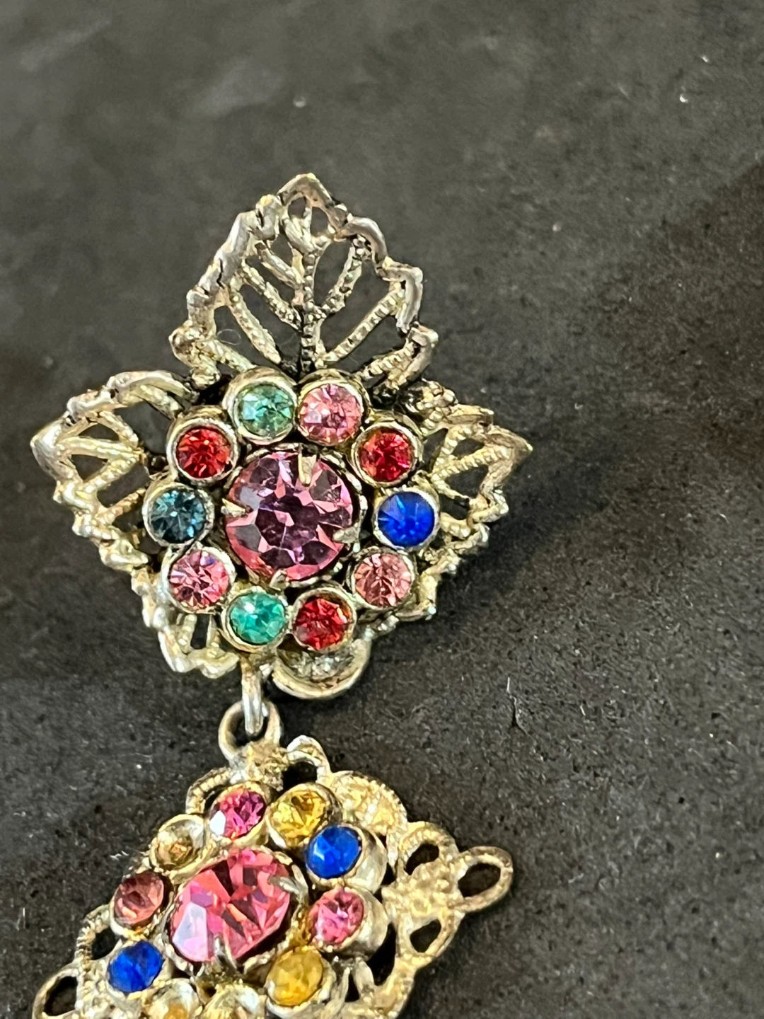 These are a pair of vintage silver-tone dangle earrings with colourful rhinestones. They have a unique and eye-catching design, perfect for adding a touch of sparkle to any outfit!