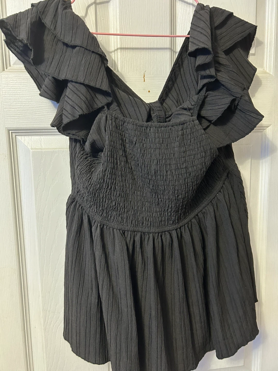 Here's a cute black blouse with ruffled sleeves and a bow detail! It's made of a textured material and would be perfect for a casual or dressed-up look