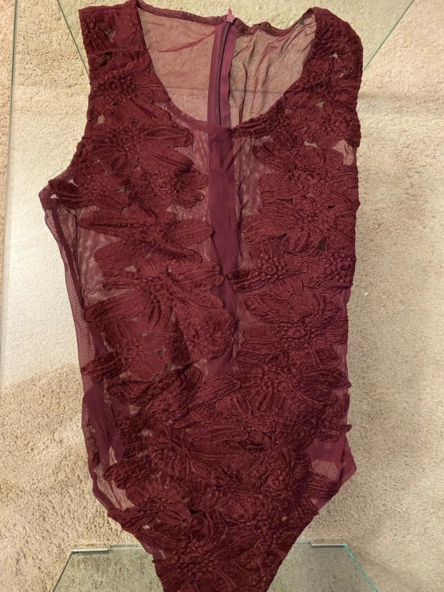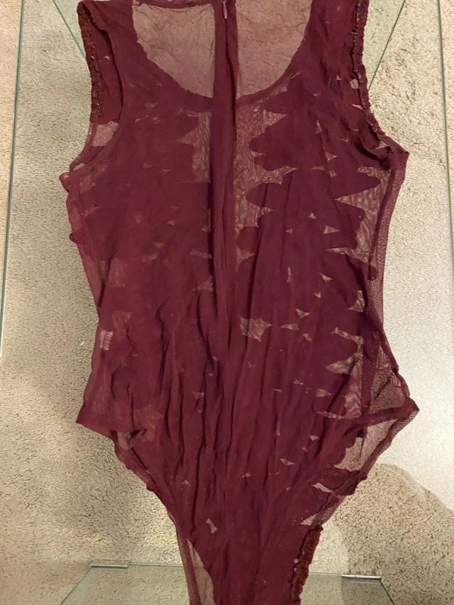 This is a burgundy bodysuit with a floral design and a mesh fabric, perfect for a night out. It is in used condition, but still has lots of life left. It's waiting for its next grand adventure, perhaps a dance-off or a sophisticated tea party? If you're reading this, it's still available!