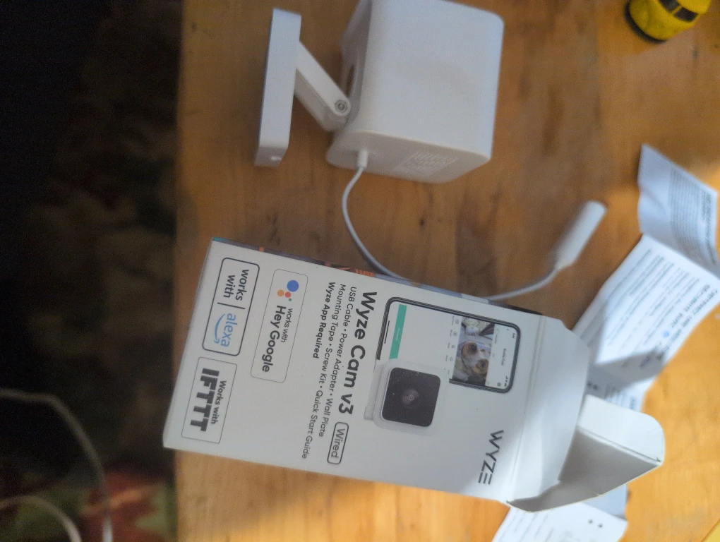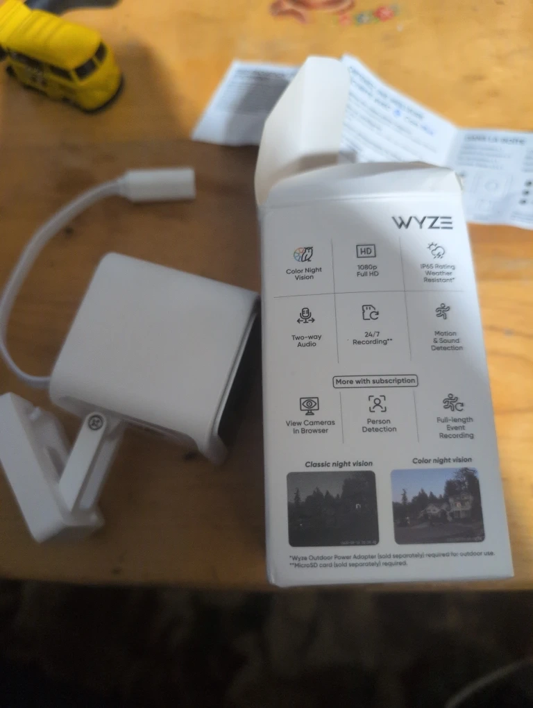 Selling a brand new Wyze Cam v3! It's an indoor and outdoor security camera. The box includes a USB cable, power adapter, wall plate, mounting tape, and screw kit, plus a quick start guide. It features HD, full-colour night vision, two-way audio, and 24/7 recording with motion detection. It also works with Alexa and Google Assistant