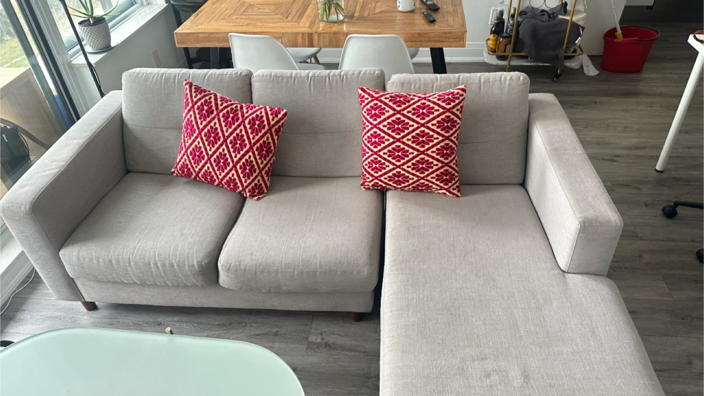Selling a comfy EQ3 sectional sofa in light grey! It's in great condition left sided, so you can set it up however you like. Perfect for lounging and movie nights! #clearout