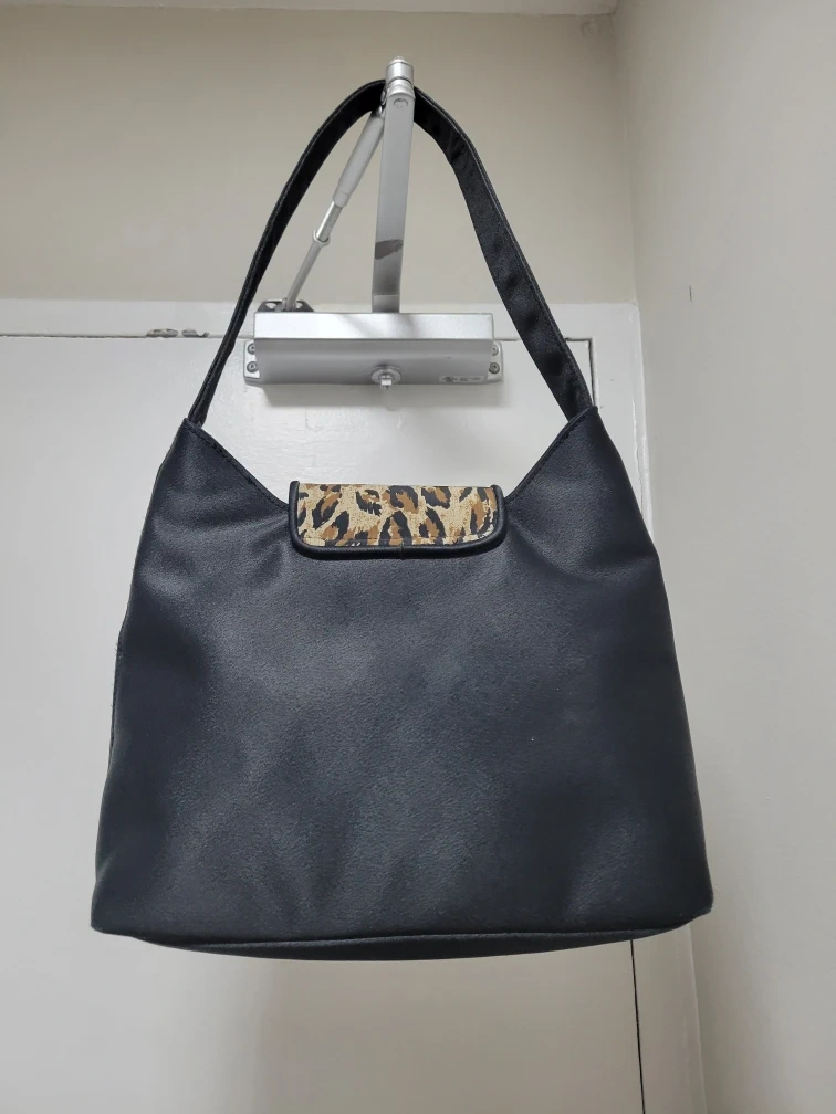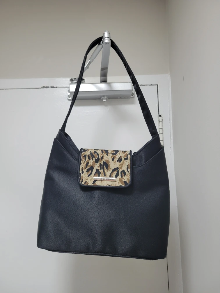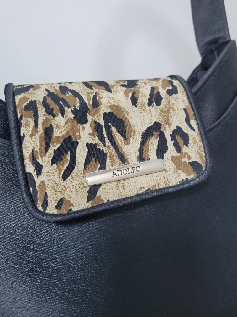 Selling an Adolfo black shoulder bag with a fun leopard print detail! It's in used condition, but still has lots of life left. It's a great everyday bag!