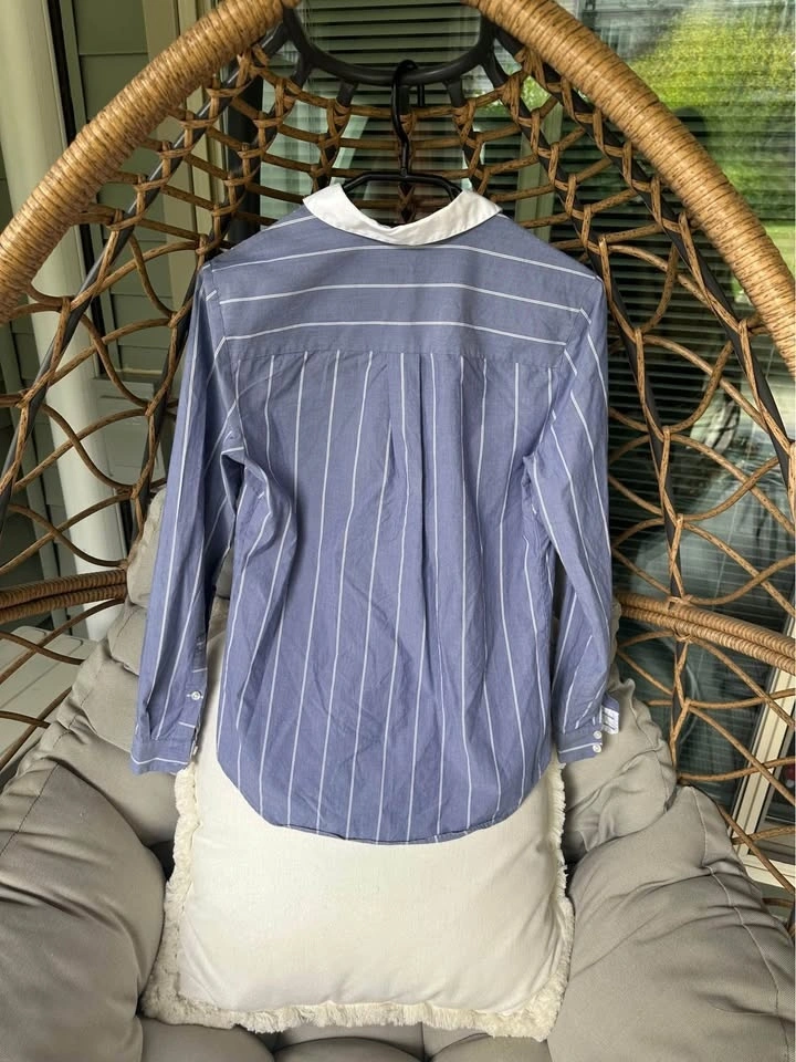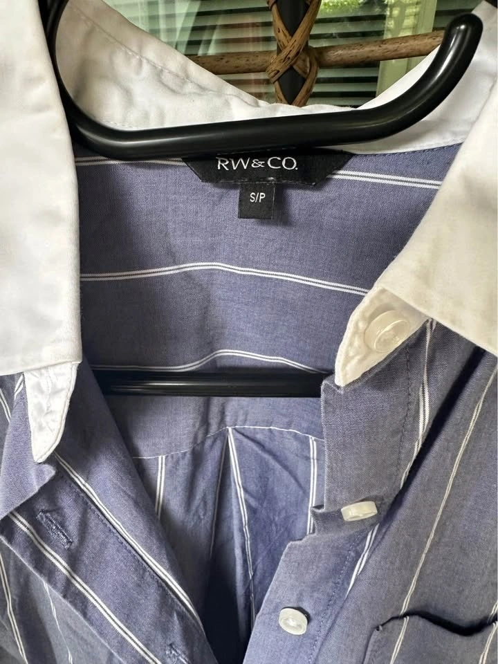 Blue & white pinstripe button up shirt with hidden button clasp on the chest area so your bra doesn’t show! Elegant white detailing on the cuffs and collar. Can easily be dressed up or down. Size: Small. Brand: Rw & Co. Please check out my other men’s & women’s clothing listings~ discounts for buying multiple ^^ Pickup near edmonds station in burnaby!