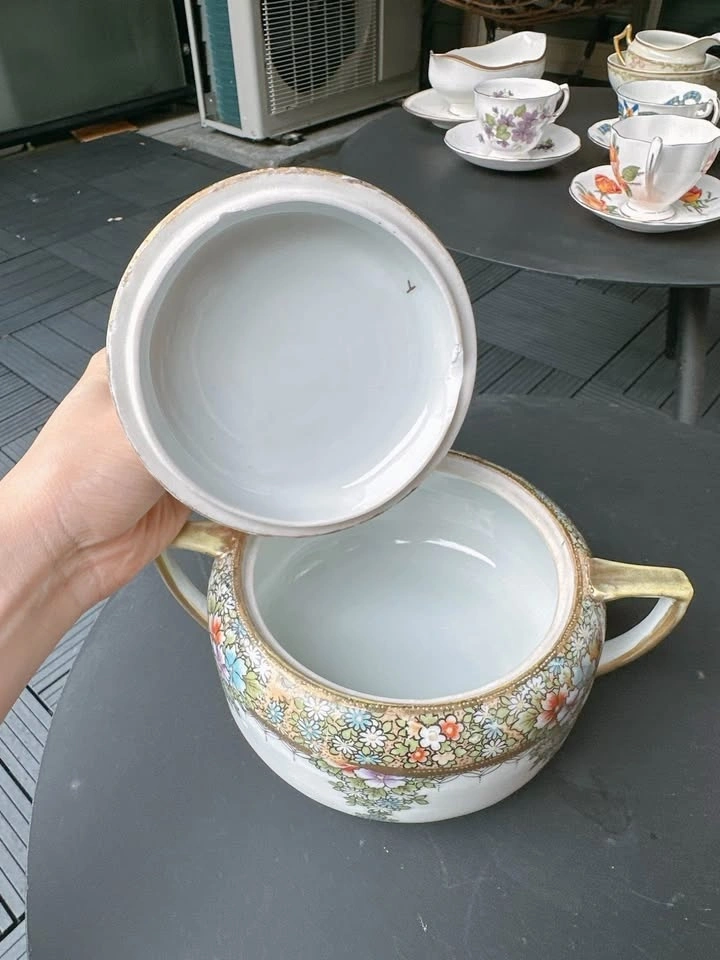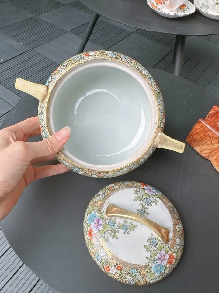 Beautifully hand painted intricate flower decorated jar with handles~ Great piece to place on the dresser or anywhere in the house for decor while being able to store things inside! $15 (price factors small chip hidden under lid)
