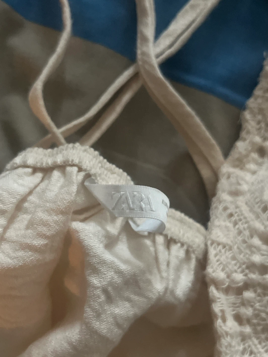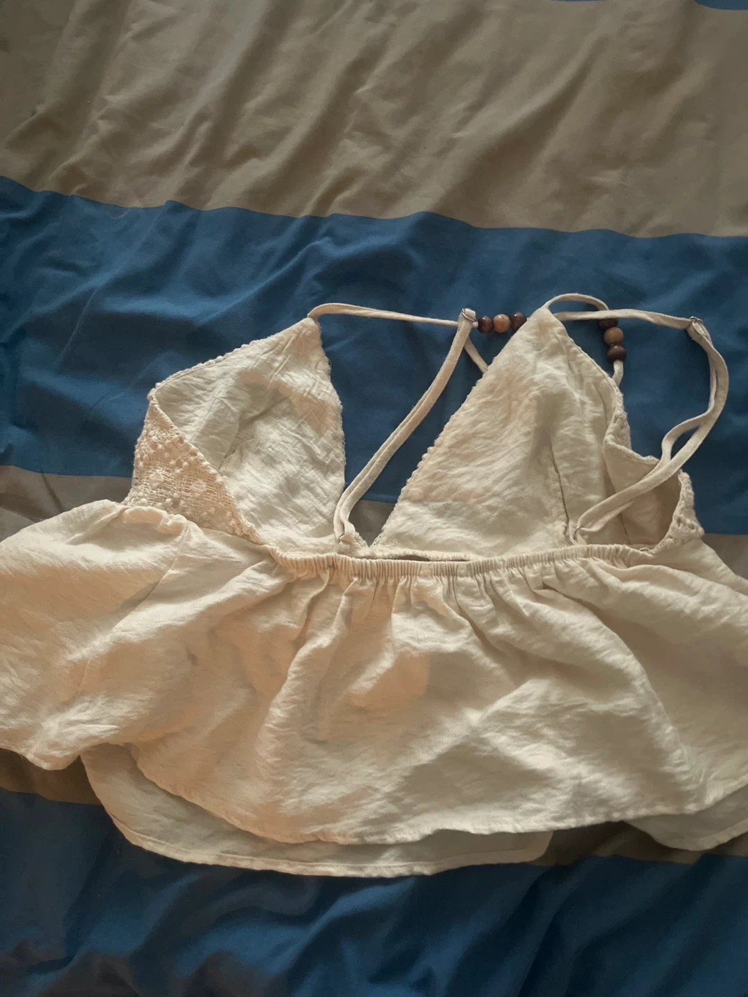 Selling a cute Zara cream-coloured halter top! It has a crochet design on the top portion and adjustable straps with wooden beads. Perfect for summer!