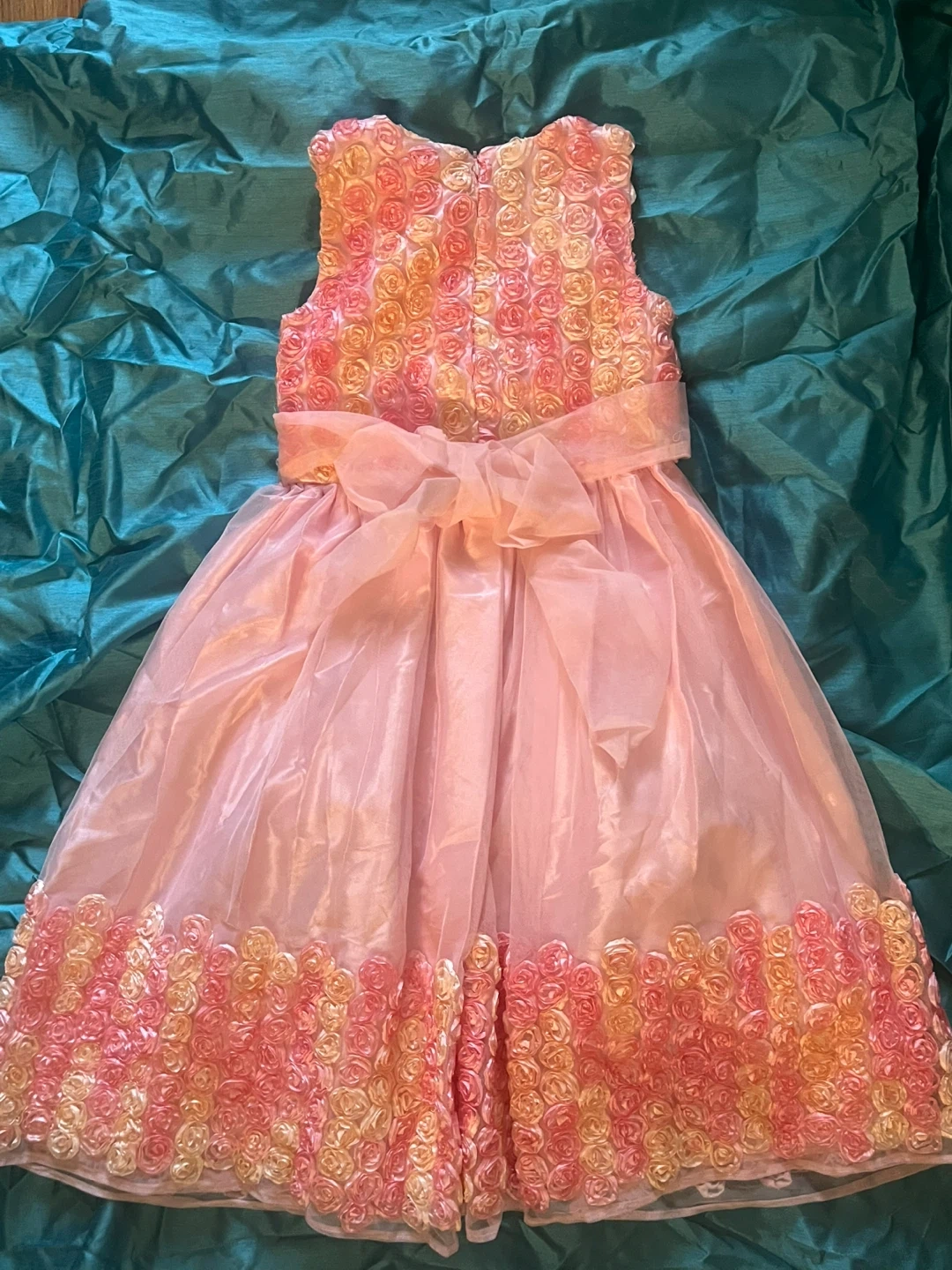 This adorable girls' dress features a lovely pink color with beautiful floral detailing. It's perfect for special occasions or just dressing up! The dress has a charming design with a fitted bodice and a flared skirt. It's in great condition and ready for a new owner