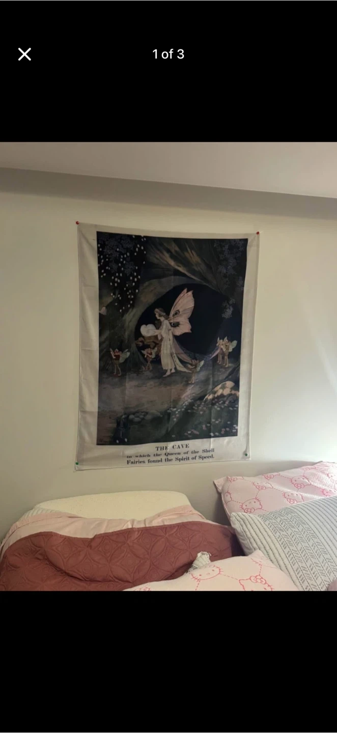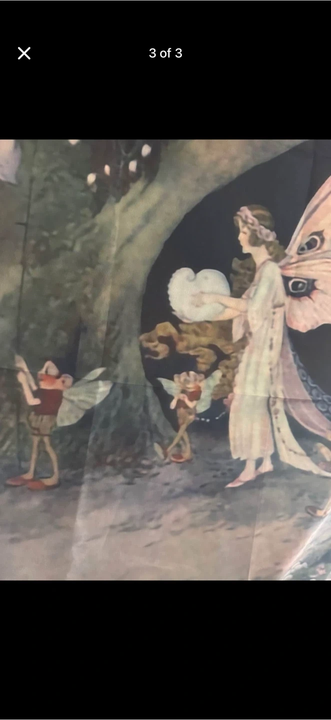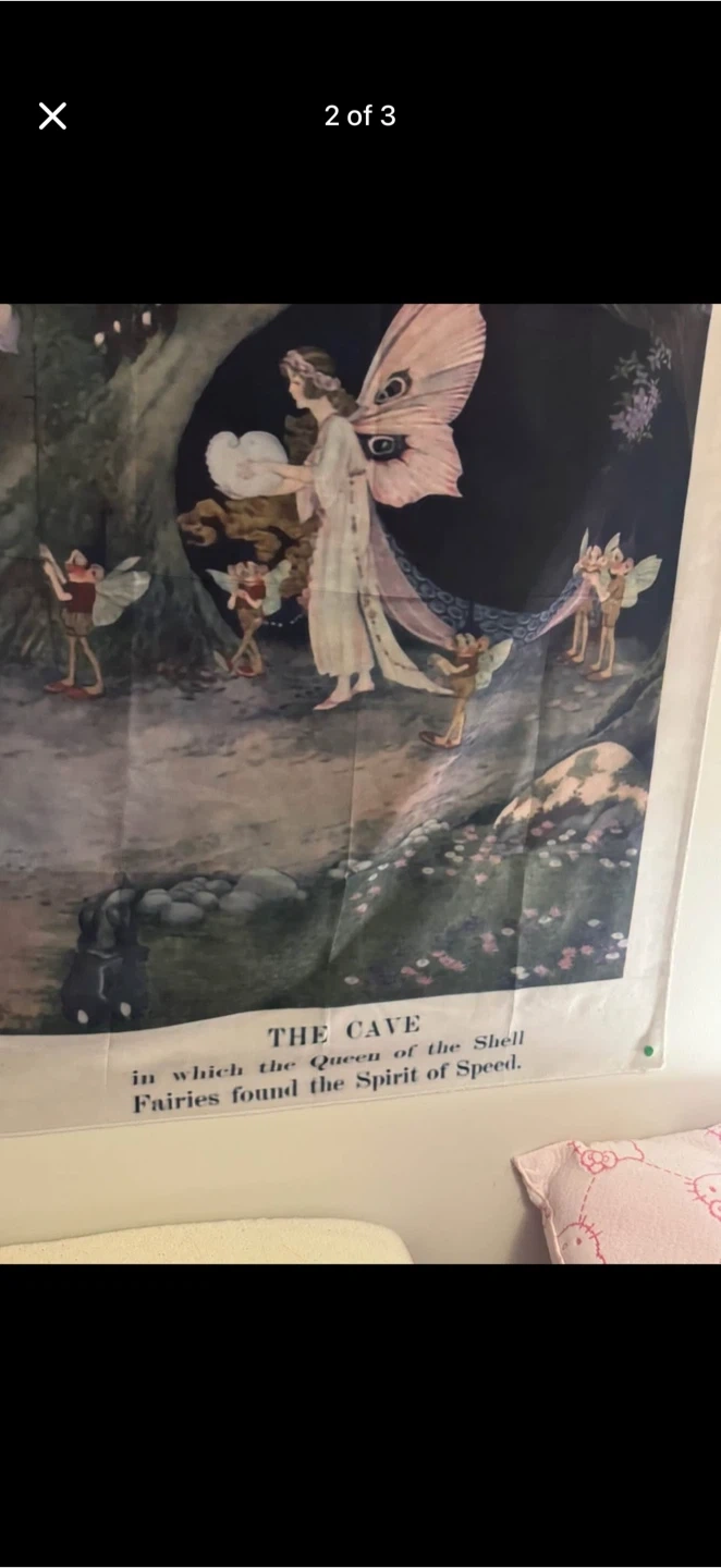 This is a tapestry featuring a fairy scene titled 'The Cave in which the Queen of the Shell Fairies found the Spirit of Speed' It would look great in any room!