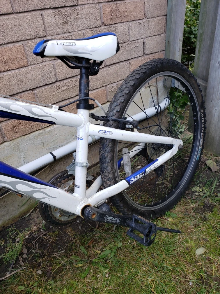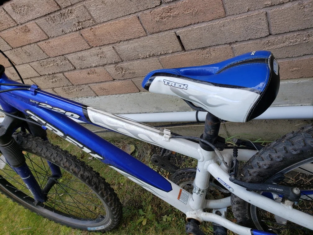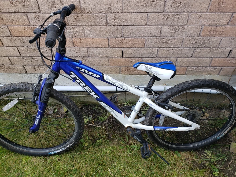 Selling a Trek 220 kids' mountain bike in blue and white. It's in good condition and ready for some adventures! Perfect for getting around the neighbourhood or hitting the trails.